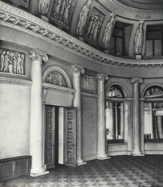ИСТОЧНИК Елагин дворец . Перестроен Карлом Росси в 1818-1822 годах из усадьбы XVIII века . Парадная Передняя украшена скульптуры весталок (жриц богини Весты) . Четыре двери и рамы надкаминных зеркал облицованы шпоном березы и . . .