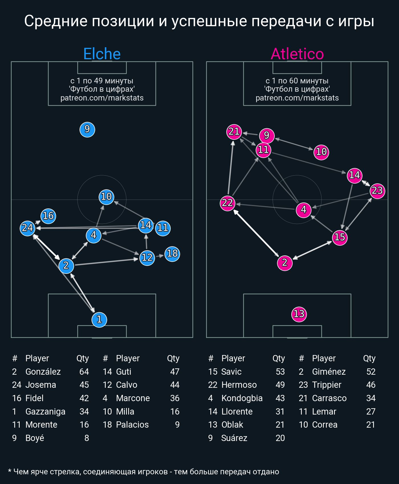 ▪ 44 успешных передач из 53 попыток (4 с продвижением, )