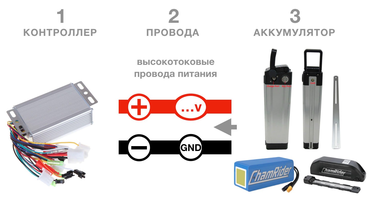🔹 Контроллер. Главное предназначение - обеспечить работу мотора распределяя напряжение и ток от аккумулятора к обмоткам электродвигателя через фазные провода. Может задействовать различные датчики для воздействия на работу электромотора. Обеспечивает нужным напряжением некоторые датчики и принимает сигналы от всех датчиков. Например, датчик ручки тормоза и датчик педалей выдают сигнал для остановки или запуска двигателя, регулируемый датчик скорости меняет обороты мотора, датчик оборотов колеса формирует сигнал для определенияг скорости ЭТ. Выдает нужное напряжение для освещения ЭТ и обеспечивает другие полезные функции. Работает по заложенной программе, которую в некоторых контроллерах можно изменить. Например, ограничить скорость или мощность ЭТ