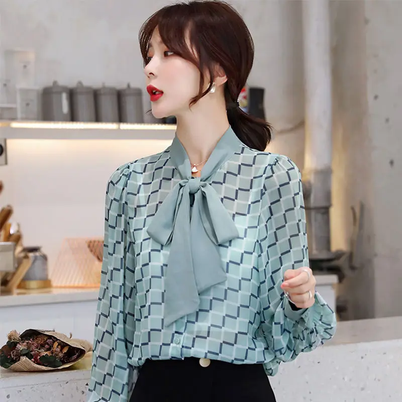 "Elegant Plaid Printed Bow Chiffon Shirts 2022 Spring New Fashion Office Lady Loose Pullovers V-Neck Lantern Sleeve Woman Blouses" * Buy Now Just For 12$