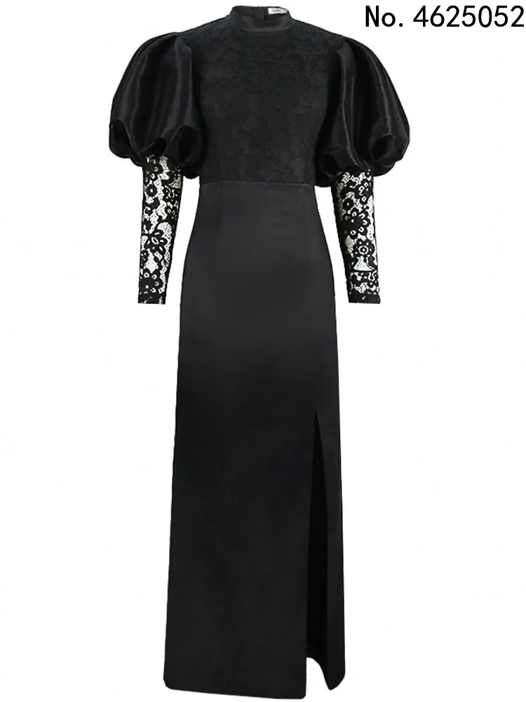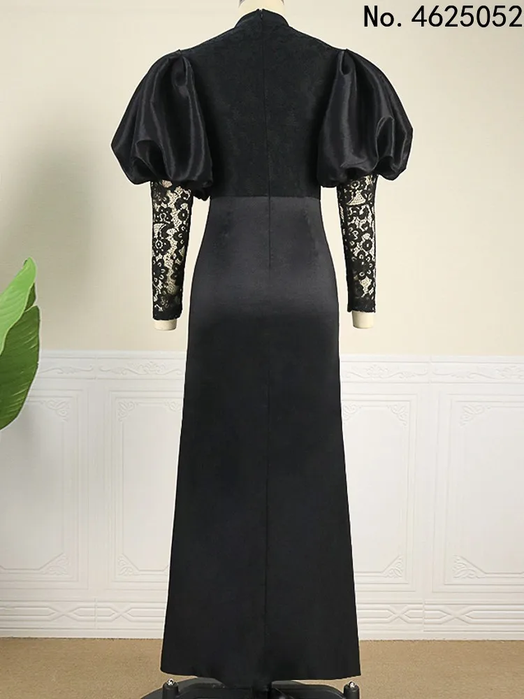 "Elegant Women Long Black Dresses Formal Party Evening Stand Neck Fluffy Sleeve High Slit Lace Robes Big Size Spring Summer 2023" * Buy Now Just For 15$