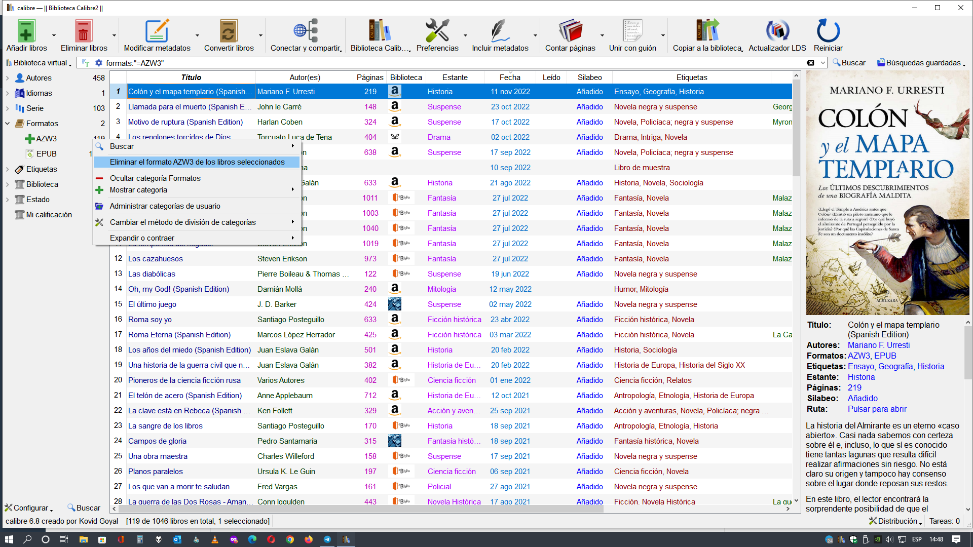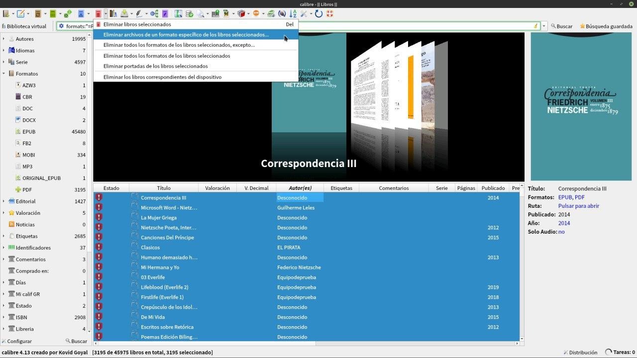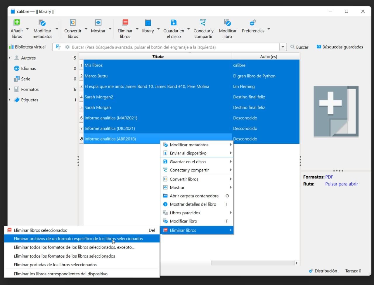 2. Botón derecho del ratón encima de la selección y eliges "eliminar libros"