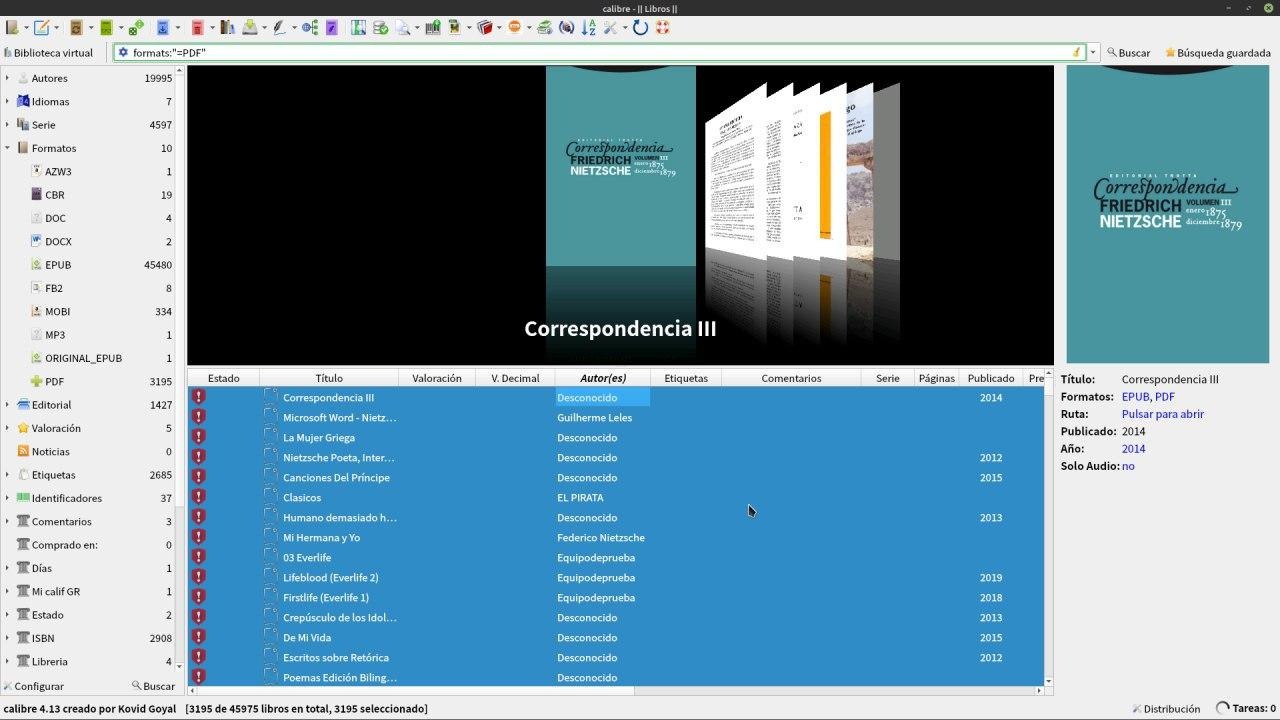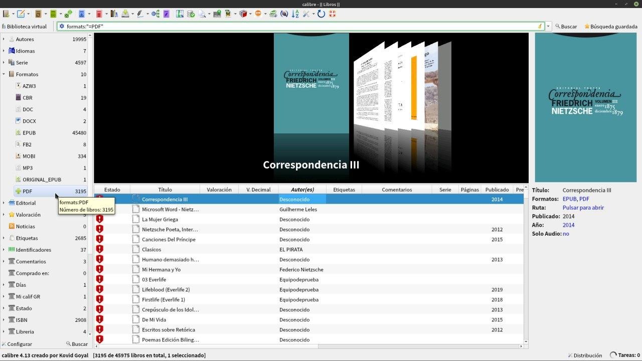Yo como tengo configurado que el añadir un libro me lo transforme a mi formato favorito puedo irme a la categoría Formatos y en este caso seleccionar pdf ( y estoy seguro que todos esos libros de pdf se transformaron a epub).