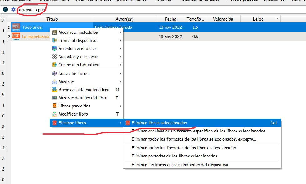 Buscando .original_epub en la barra de herramientas, libro seleccionado, botón derecho del mouse eliminar libro seleccionado.