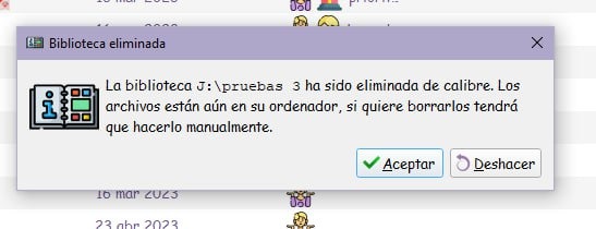 Esta es la otra manera que le comentaba a @jane_morris si sabemos el nombre de la biblioteca podemos eliminar directamente la carpeta, en este caso la biblioteca de Josep le damos en eliminar por fuera de Calibre. Esto también sirve para que Calibre no registre esta biblioteca copiandola en otro lado y después sacarla de la lista de cambio rápido.