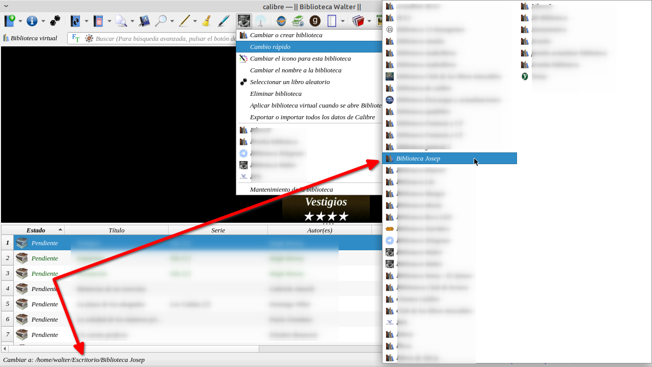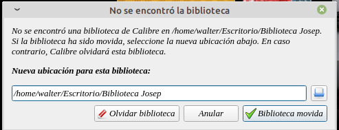 Cuando entremos en Calibre y desde el cambio rápido seleccionemos la biblioteca de Josep que previamente eliminamos o cambiamos de ubicación. Calibre nos dará un aviso.
