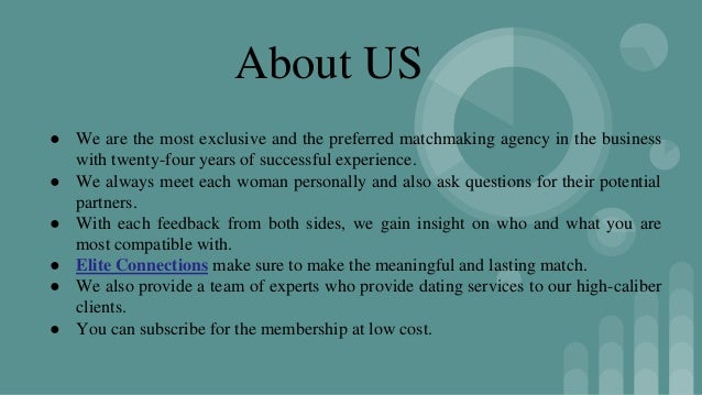 Welcome to Elite Connections International Matchmaking Agency . We are the most exclusive and preferred professional matchmaking service in the business, with over twenty-seven years of unparalleled success . Our executive dating service has a proven track record of lasting matches, with thousands of happy clients and an A+ business rating .