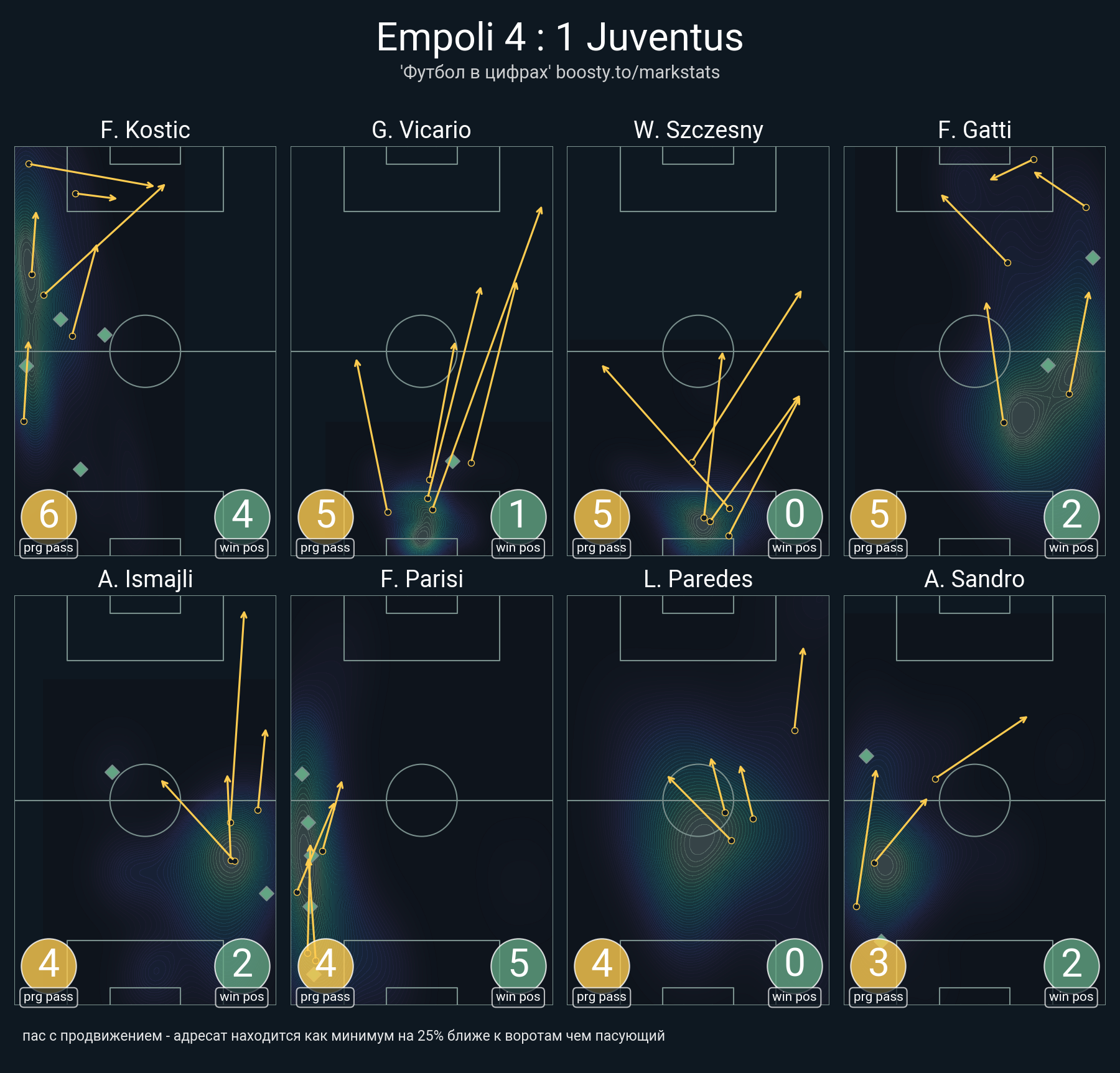 36 успешных передач из 44 попыток (1 ассист, 2 под удар, 2 с продвижением, 7 на трети соперника)