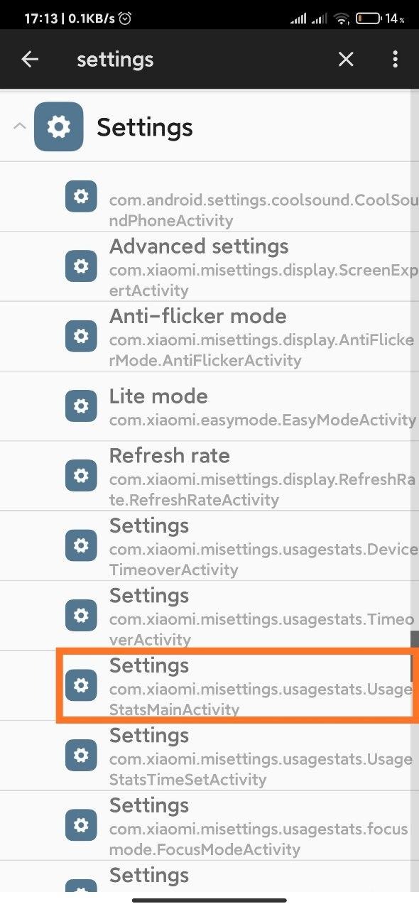 1.4 Tap "Settings" and find "Settings" com.xiaomi.misettings.usagestats.UsageStatsMainActivity and tap it !