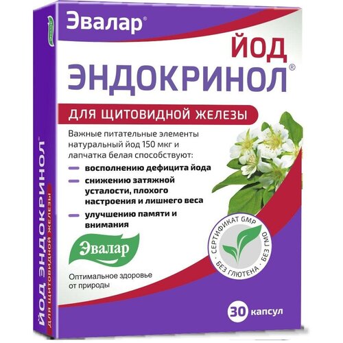 Description\nIl est désormais reconnu que la carence en iode est un phénomène naturel et universel. La carence en iode se produit dans toute la Fédération de Russie, ainsi que dans de nombreux autres pays, notamment dans la plupart des pays européens. Selon l'OMS, environ 85 % de la population russe vit dans des zones présentant une carence en iode. En termes de composition chimique, le sol de la plupart des territoires russes est pauvre en iode. En conséquence, toutes les plantes ont une teneur en iode insuffisante. En outre, des changements importants dans la nature de l'alimentation en Russie ont joué un rôle majeur dans le développement de la carence en iode ces dernières années...Il est désormais reconnu que la carence en iode est un phénomène naturel et universel. La carence en iode se produit dans toute la Fédération de Russie, ainsi que dans de nombreux autres pays, notamment dans la plupart des pays européens. Selon l'OMS, environ 85 % de la population russe vit dans des zones carencées en iode. En termes de composition chimique, le sol de la plupart des territoires russes est pauvre en iode. En conséquence, toutes les plantes ont une teneur en iode insuffisante. En outre, des changements importants dans le régime alimentaire des Russes ont joué un rôle majeur dans le développement de la carence en iode ces dernières années. La consommation de poissons de mer et de fruits de mer riches en iode a diminué. L'iode est un micronutriment vital, les besoins quotidiens, selon l'âge, sont de 100 à 200 mcg. Les conséquences d'une carence en iode peuvent être : irritabilité, fatigue, diminution mentale. développement, excès de poids - voici une liste complète de leurs manifestations. Pour éviter de tels perturbations, prenez un remède non hormonal - Endocrinol Iode à base de potentille blanche et d'iode naturel, produit par Evalar selon la norme de qualité internationale GMP. Endocrinol Iodine est une phytoformule spécialement développée qui contient des éléments nutritionnels importants nécessaires au fonctionnement normal de la glande thyroïde : iode naturel 150 mcg et potentille blanche, qui contribuent à : combler la carence en iode maintenir l'équilibre des hormones thyroïdiennes réduire la fatigue prolongée, la mauvaise humeur et les excès. poids améliorant la mémoire et l'attention
