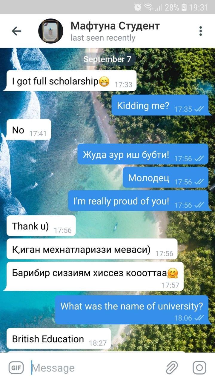 2019-йилнинг бошида онлайн дарс беришга кизикиб колган эдим. "тест" сифатида уша пайтта укиетган укувчиларимга "онлайн" тарзда дарс утиб куришни таклиф килдим. Тугриси натижаси узим кутгандан хам яхширок булди... Университетга тайёрланаётган 2 нафар укувчимнинг иккаласи хам олийгохга Грант асосида кабул килинди. Бири "BRITISH EDUCATION NCUK" га, иккинчиси "Toshkent Davlat Yuridik Universiteti"га.