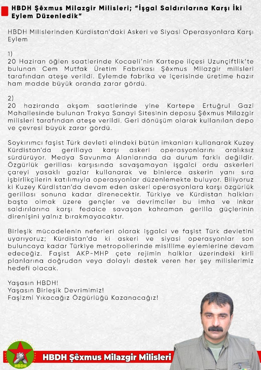 ❑ روز ۲۰ ژوئن حوالی ظهر، کارخانهٔ تولید لوازم آشپزخانه متعلق به فاشیستهای هوادار دولت در محلهٔ اوزون چیفتلیک در منطقهٔ کارتپهٔ کوجائلی به آتش کشیده شد. در این عملیات خط تولید و انبار مواد اولیه آسیب زیادی دیدند. همچنین در ۲۰ ژوئن و در ساعات عصر، انبار شهرک صنعتی تراکیا در منطقهٔ ارطغرول گازیِ منطقهٔ کارتپه به آتش کشیده شد. انباری که به عنوان مرکز بازیافت استفاده میشد در این عملیات آسیب جدی دید.