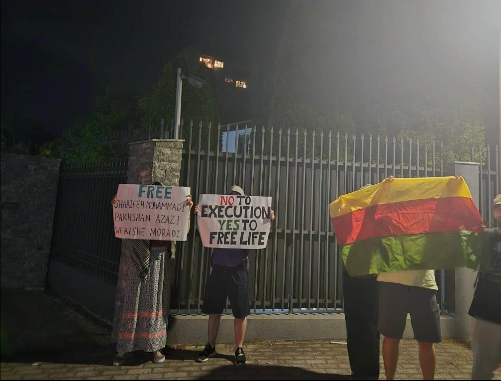❑ کنشگران در این کنش پلاکارتهایی با عناوین «آزادی برای پخشان عزیزی، شریفه محمدی و وریشه مرادی» و «نه به اعدام، آری به حیات آزاد» را برافراشتند و نامهای سرگشاده را قرائت کردند.