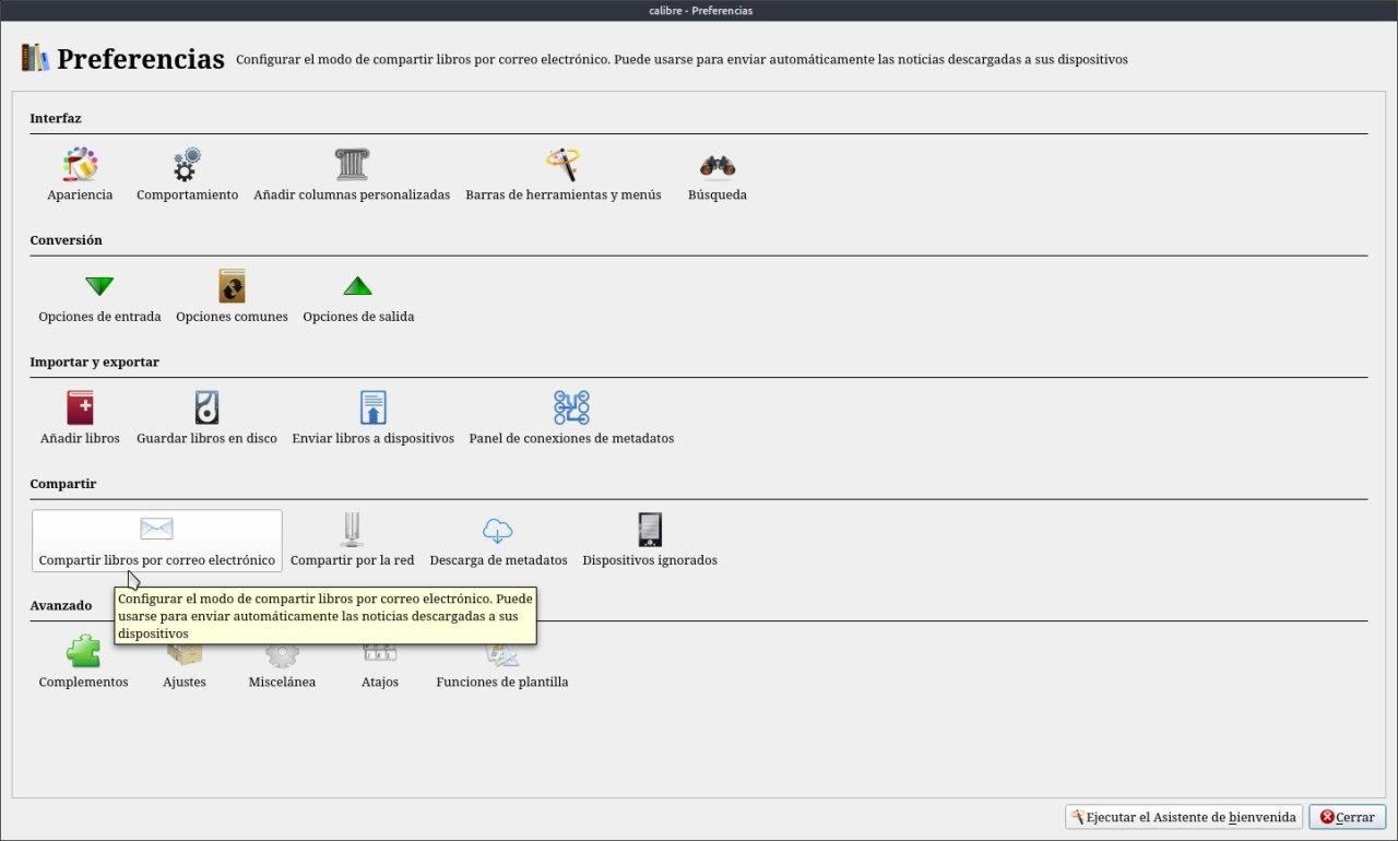WalterCon Calibre podemos enviar libros aparte de los dispositivos para leer, a direcciones de correo. Vamos a Preferencias / Compartir libros por correo electrónico.