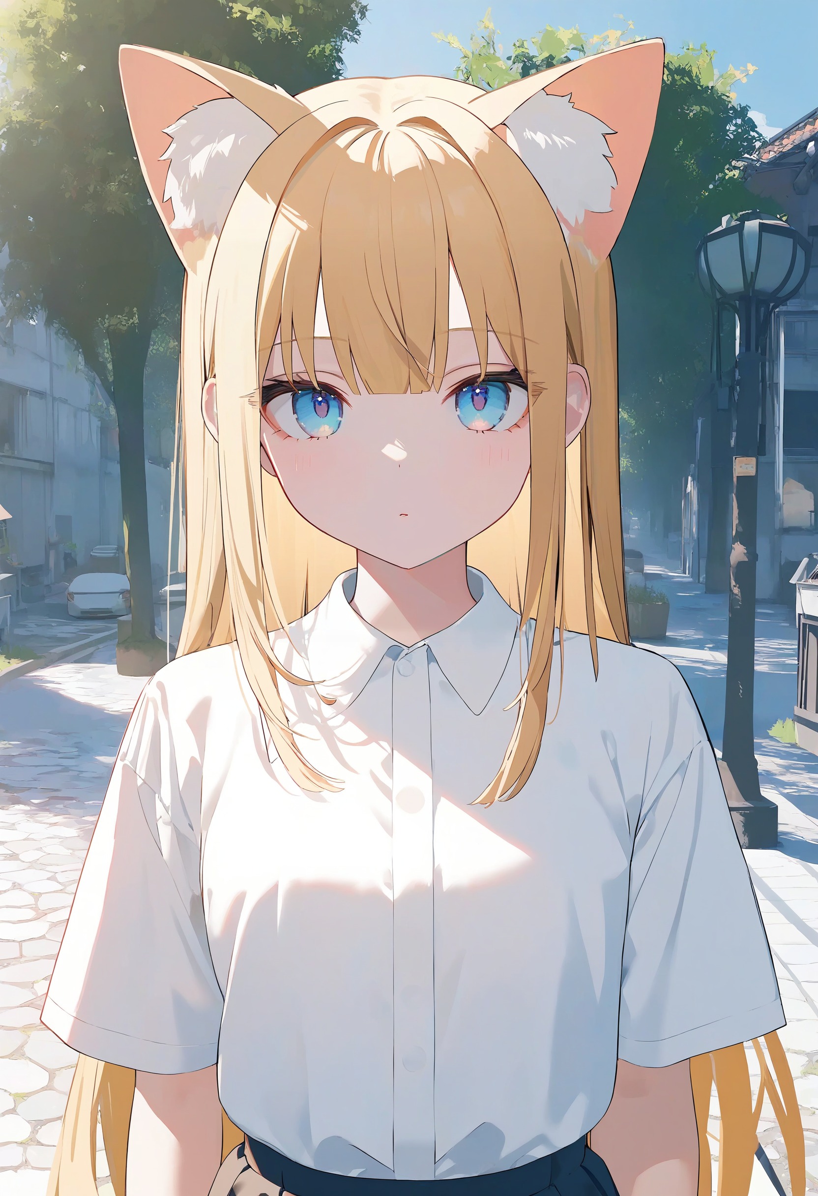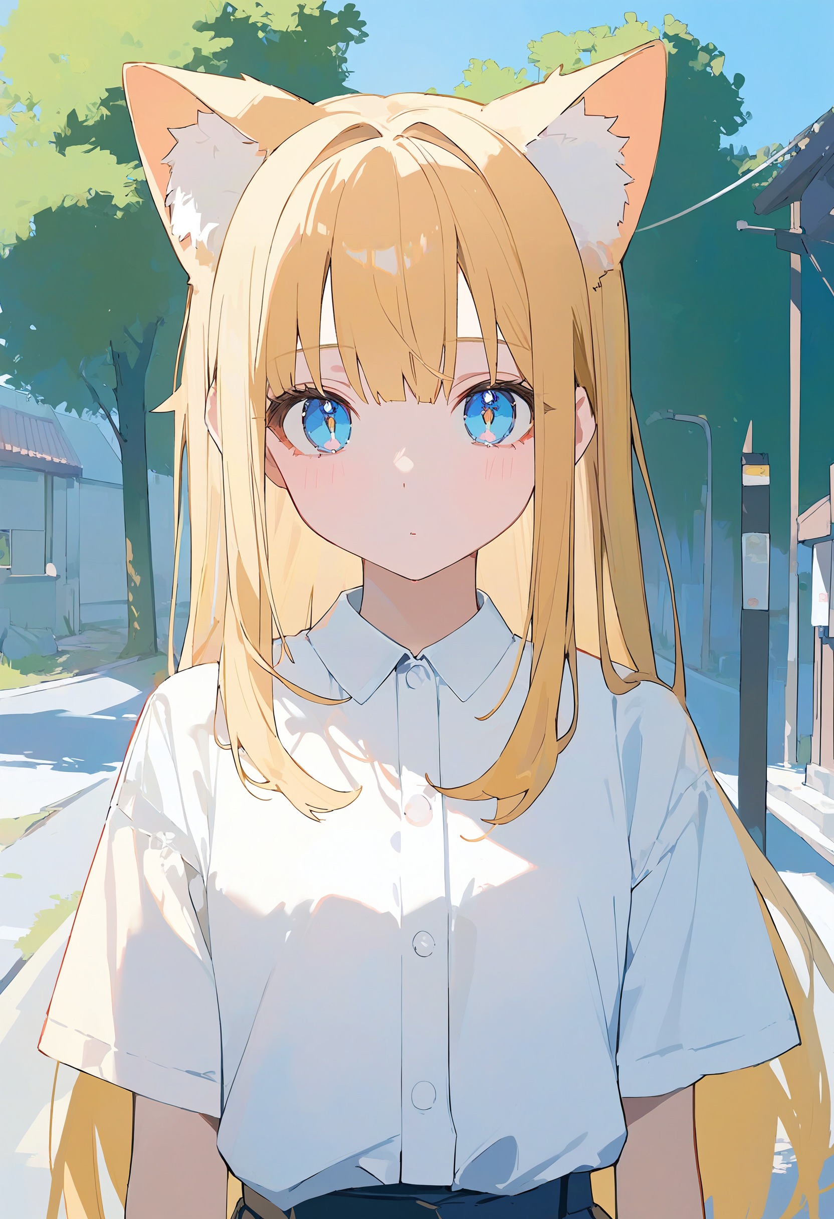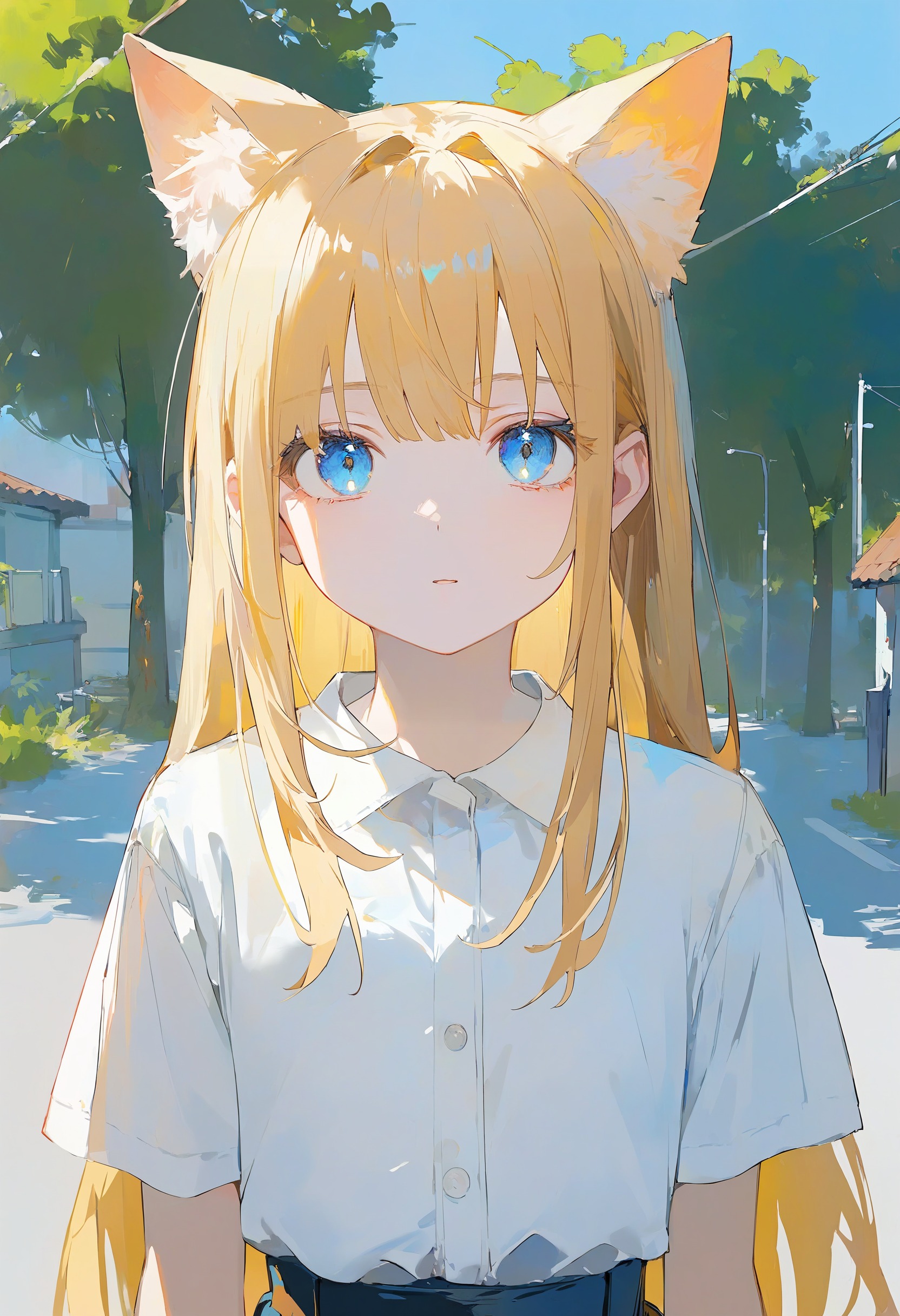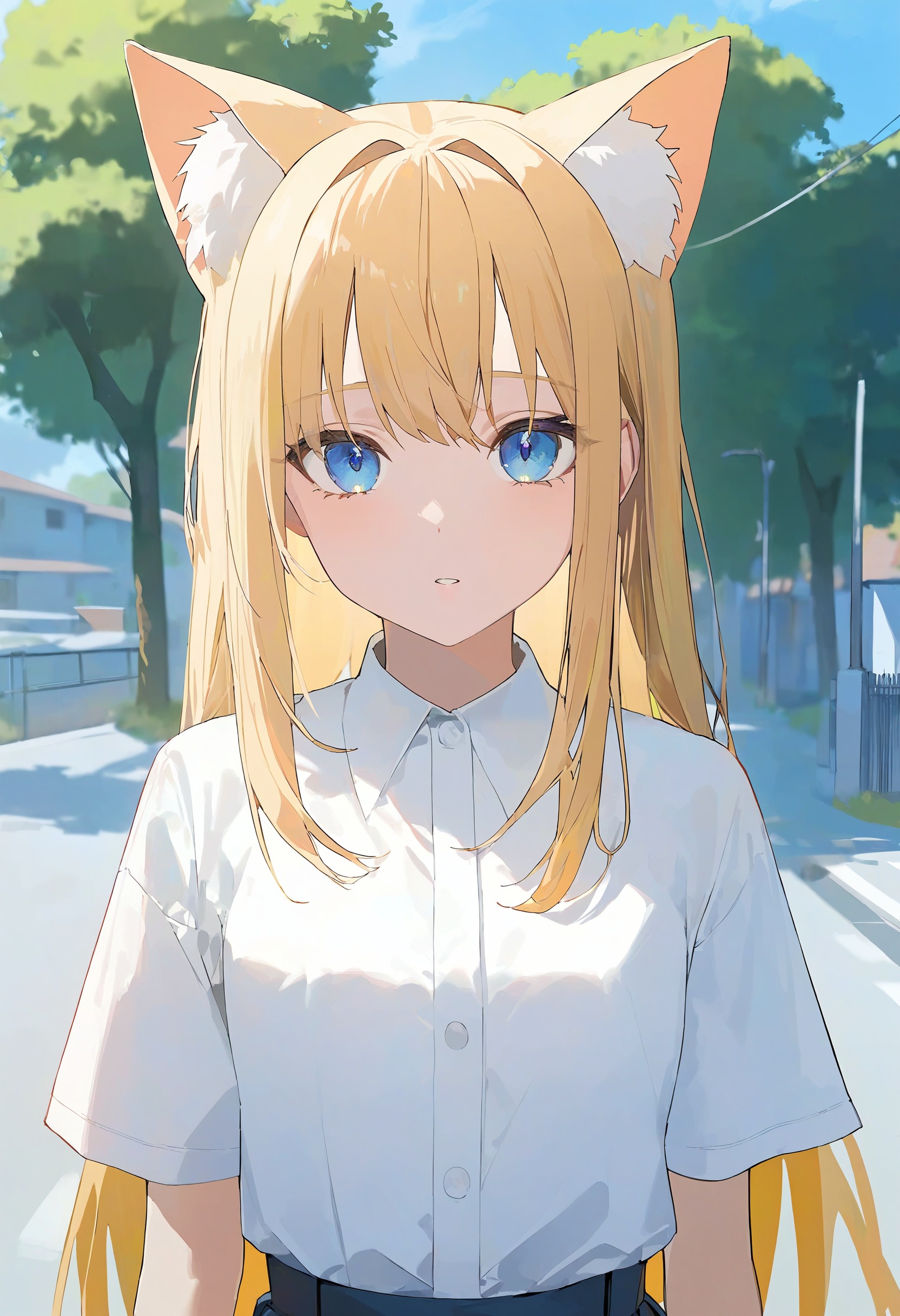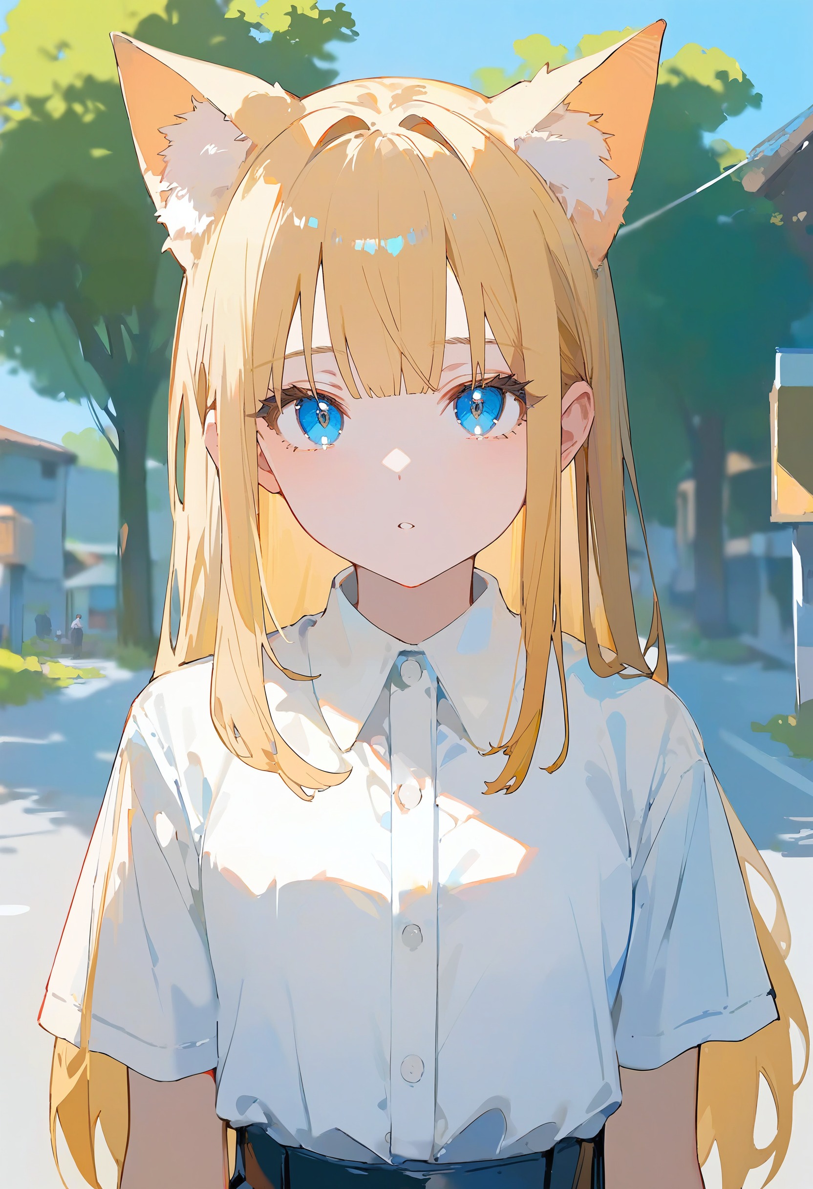 🎨 *, 1girl, cat ears, blue eyes, blonde hair, solo, white shirt, skirt, upper body, straight on, beautiful eyes, outdoors
