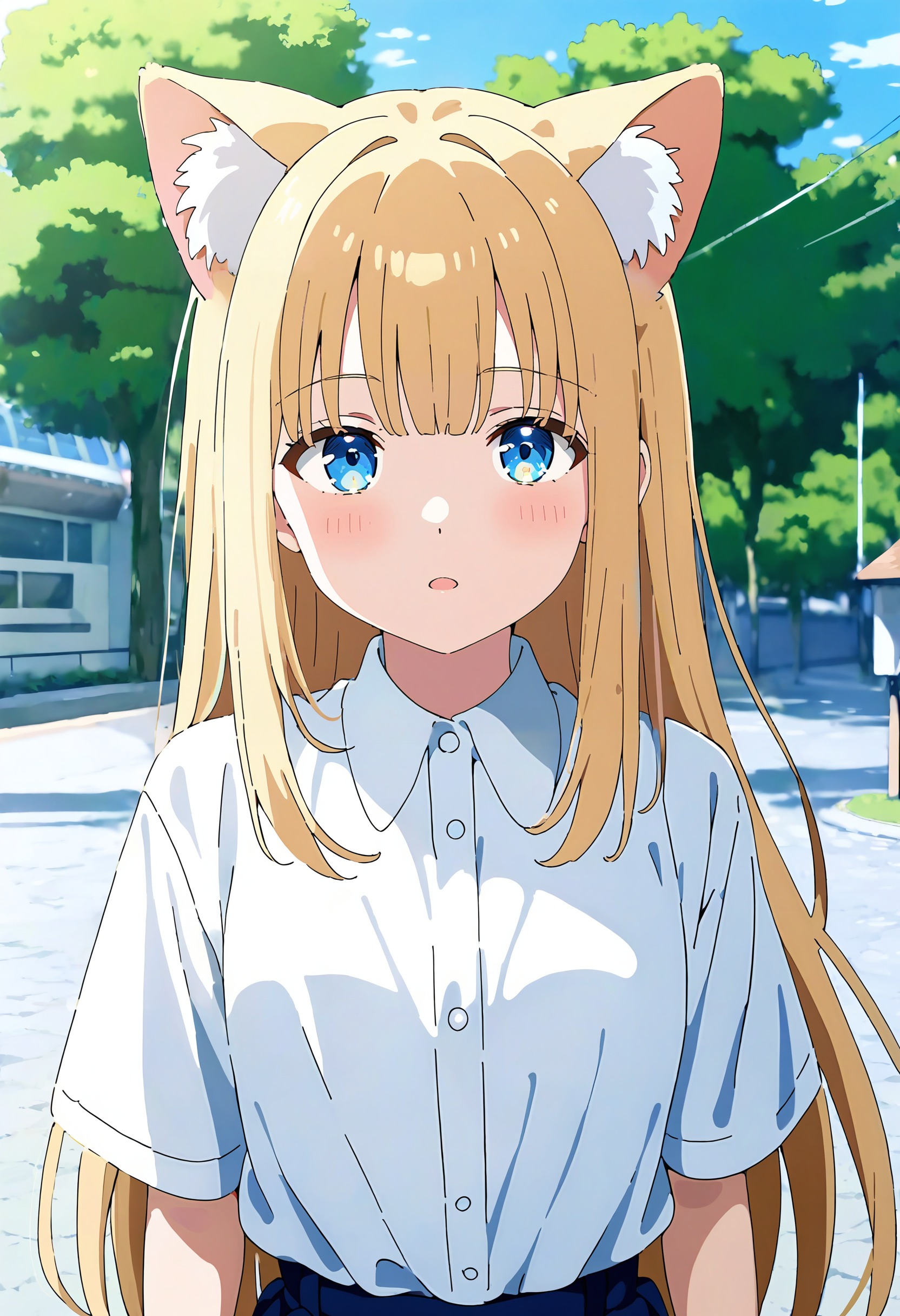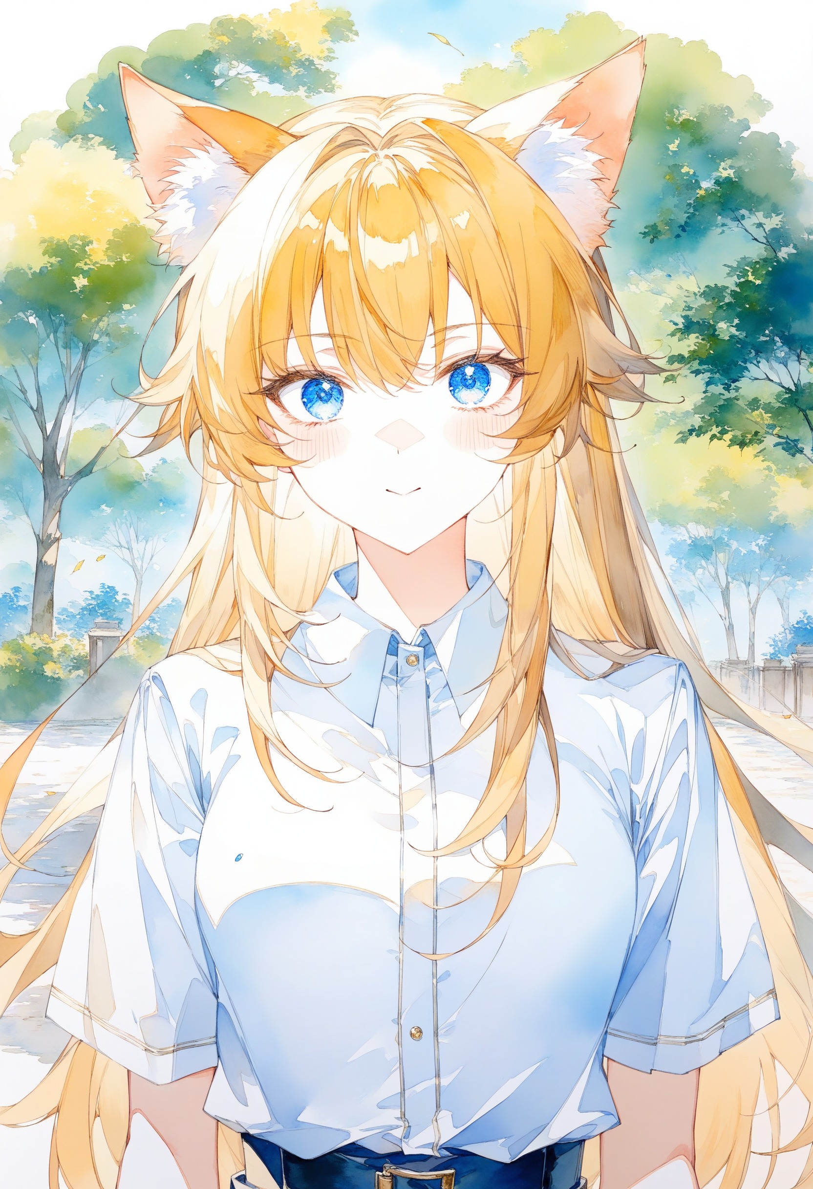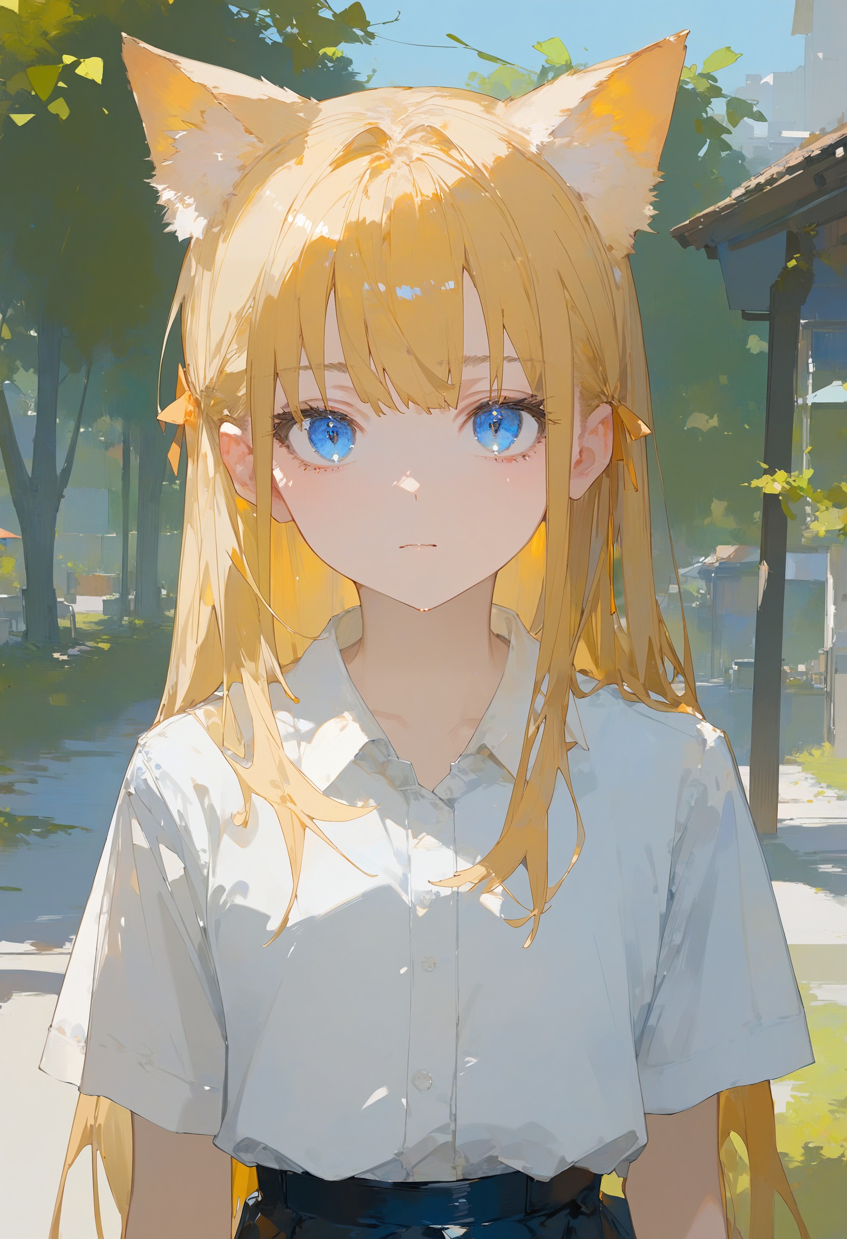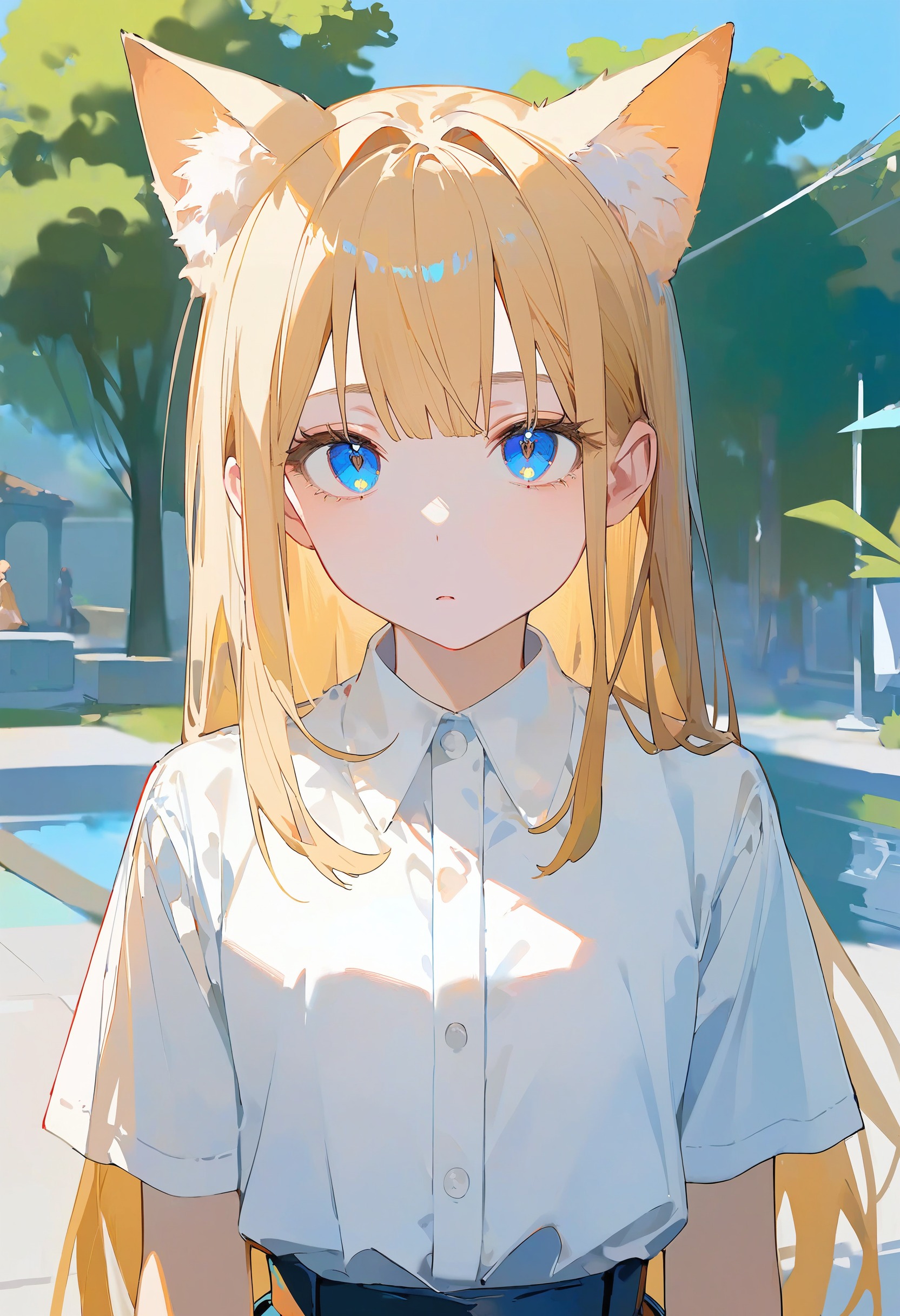 🎨 *, 1girl, cat ears, blue eyes, blonde hair, solo, white shirt, skirt, upper body, straight on, beautiful eyes, outdoors
