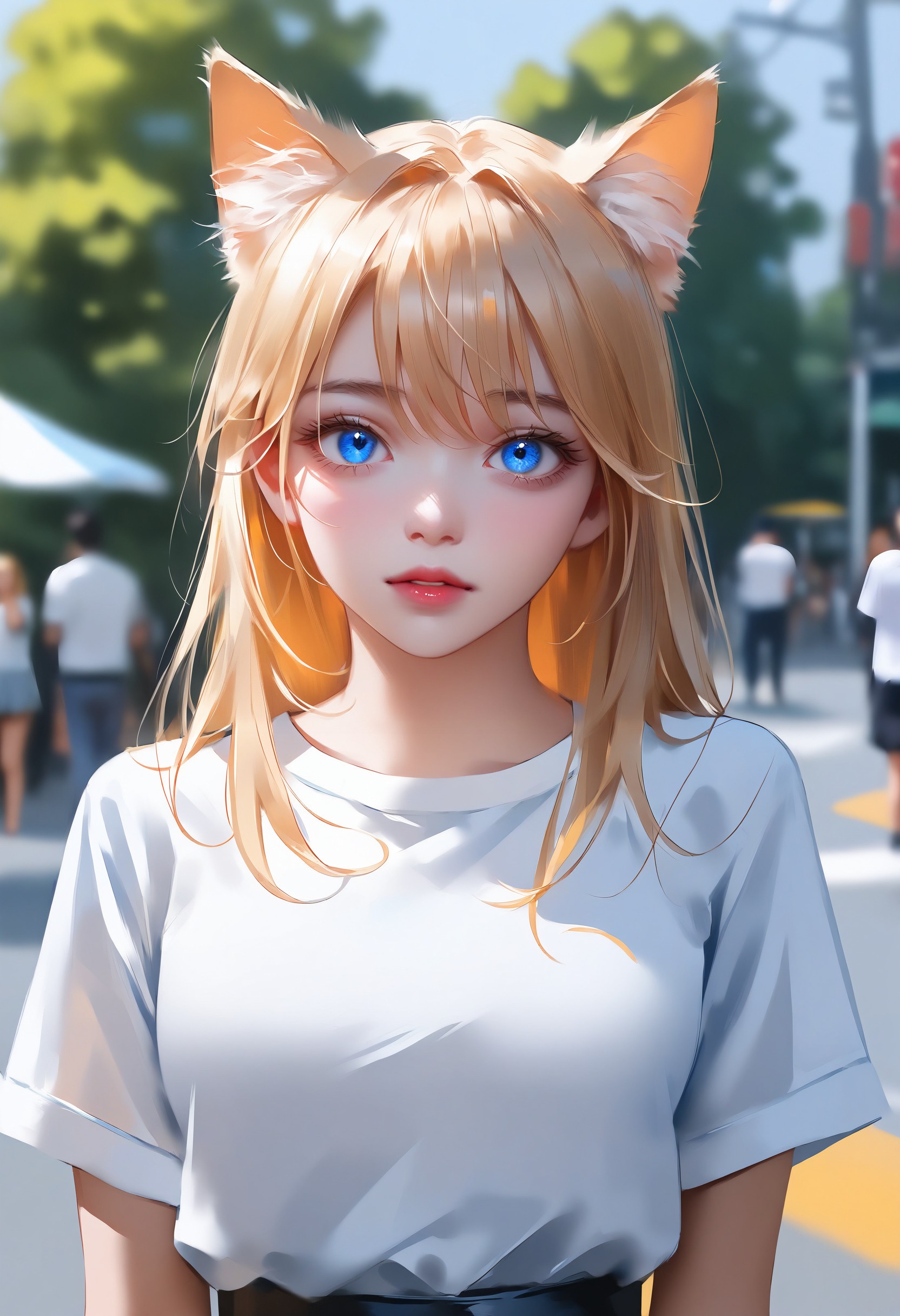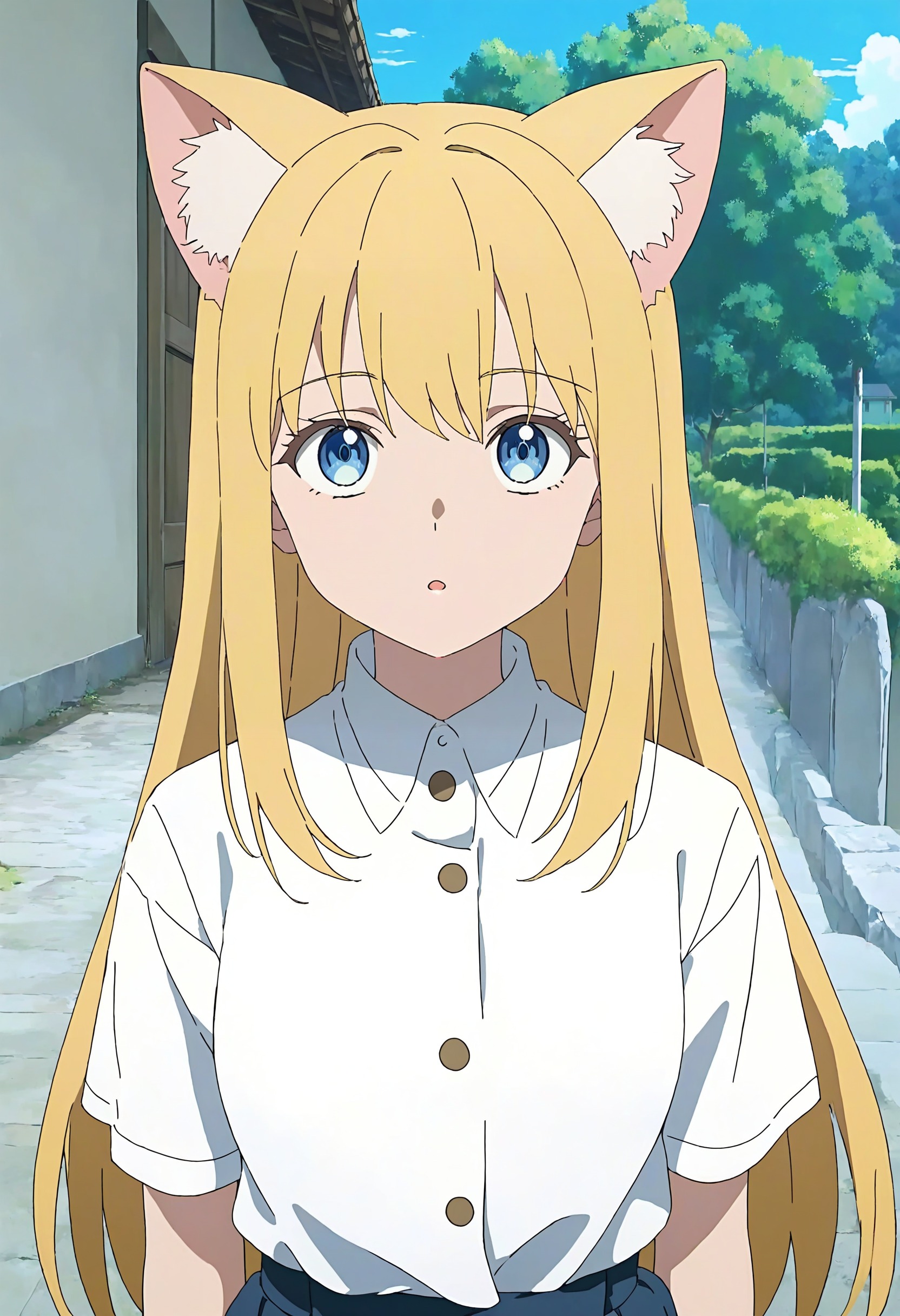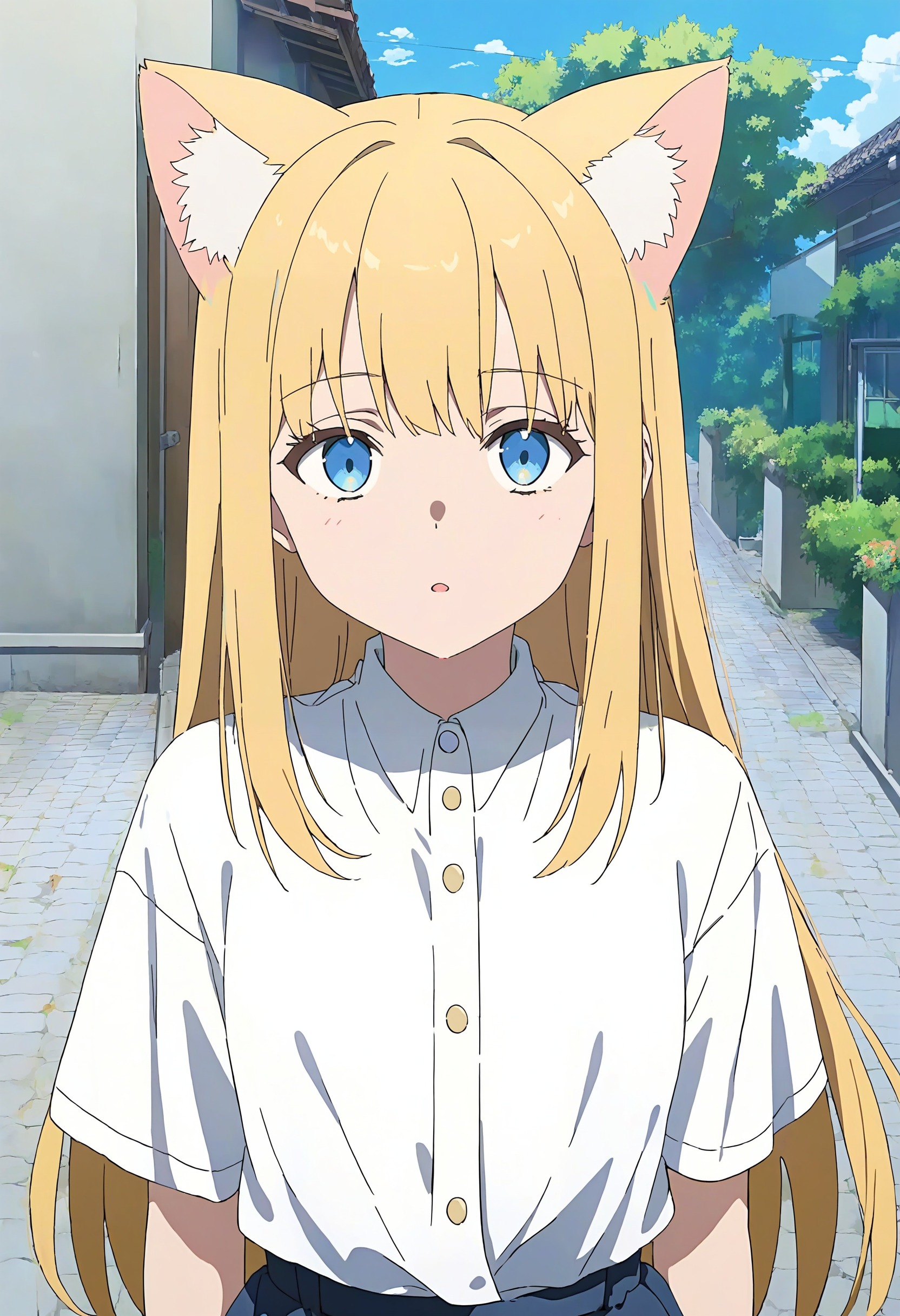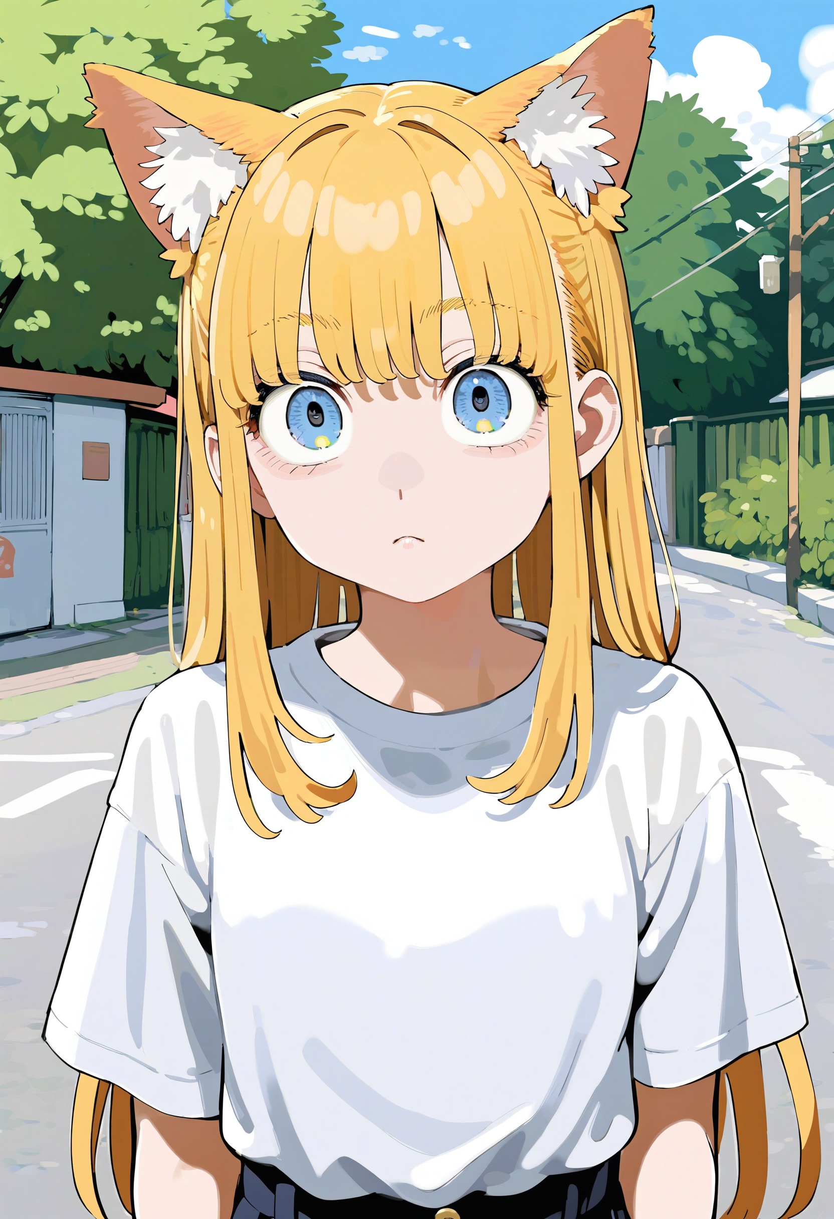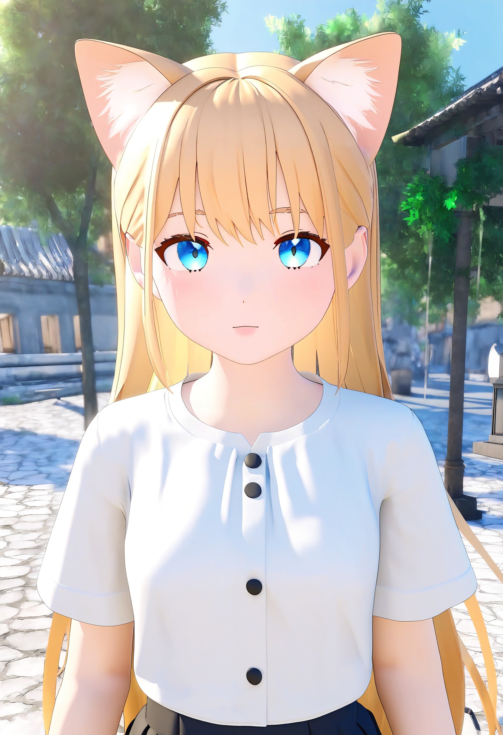 🎨 *, 1girl, cat ears, blue eyes, blonde hair, solo, white shirt, skirt, upper body, straight on, beautiful eyes, outdoors