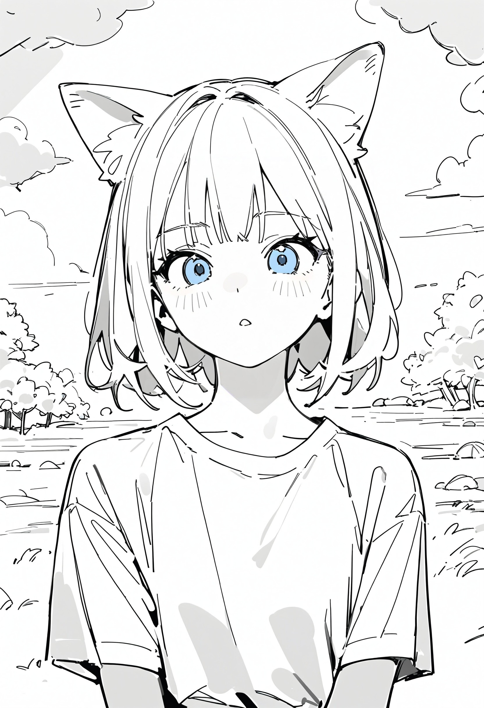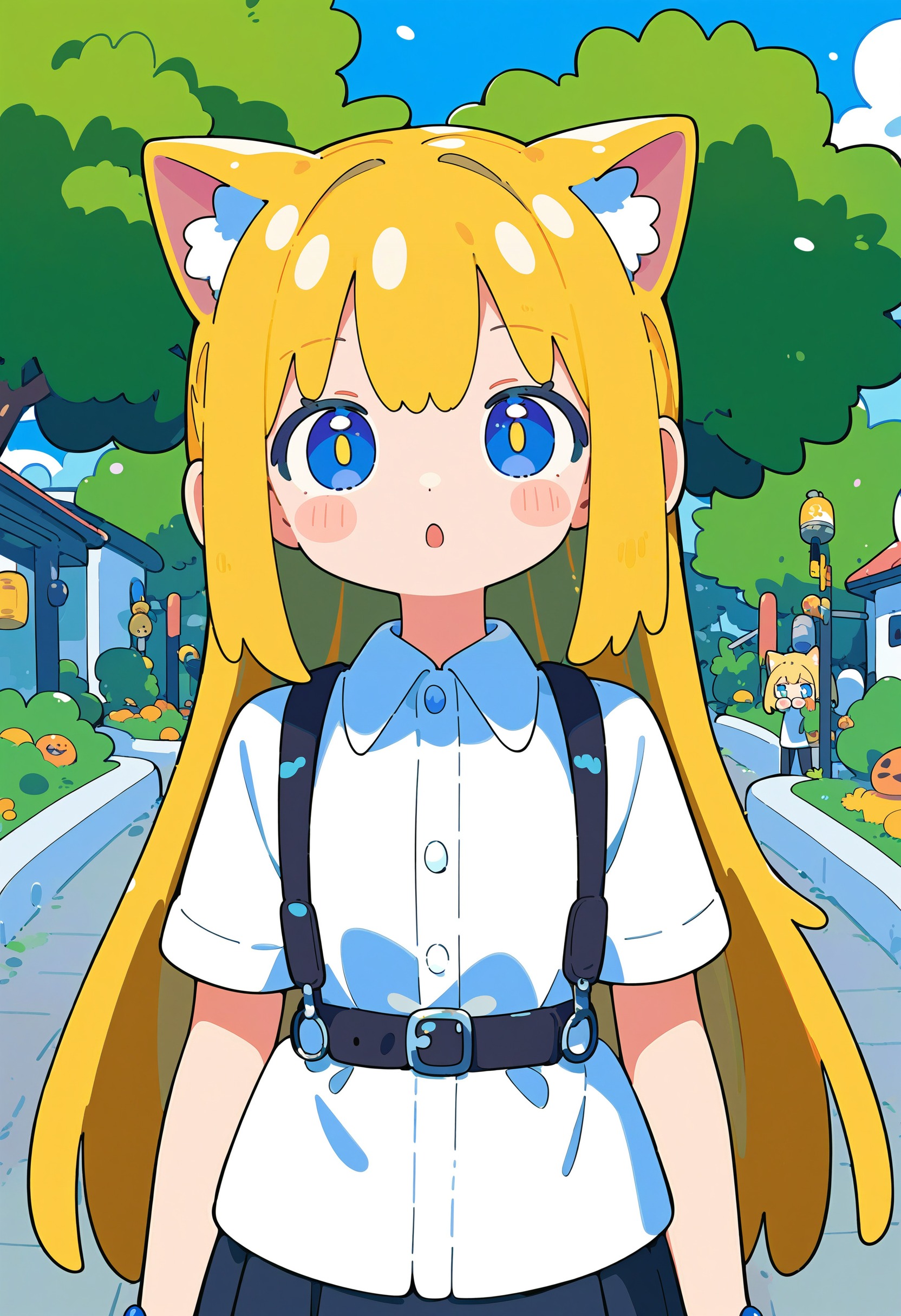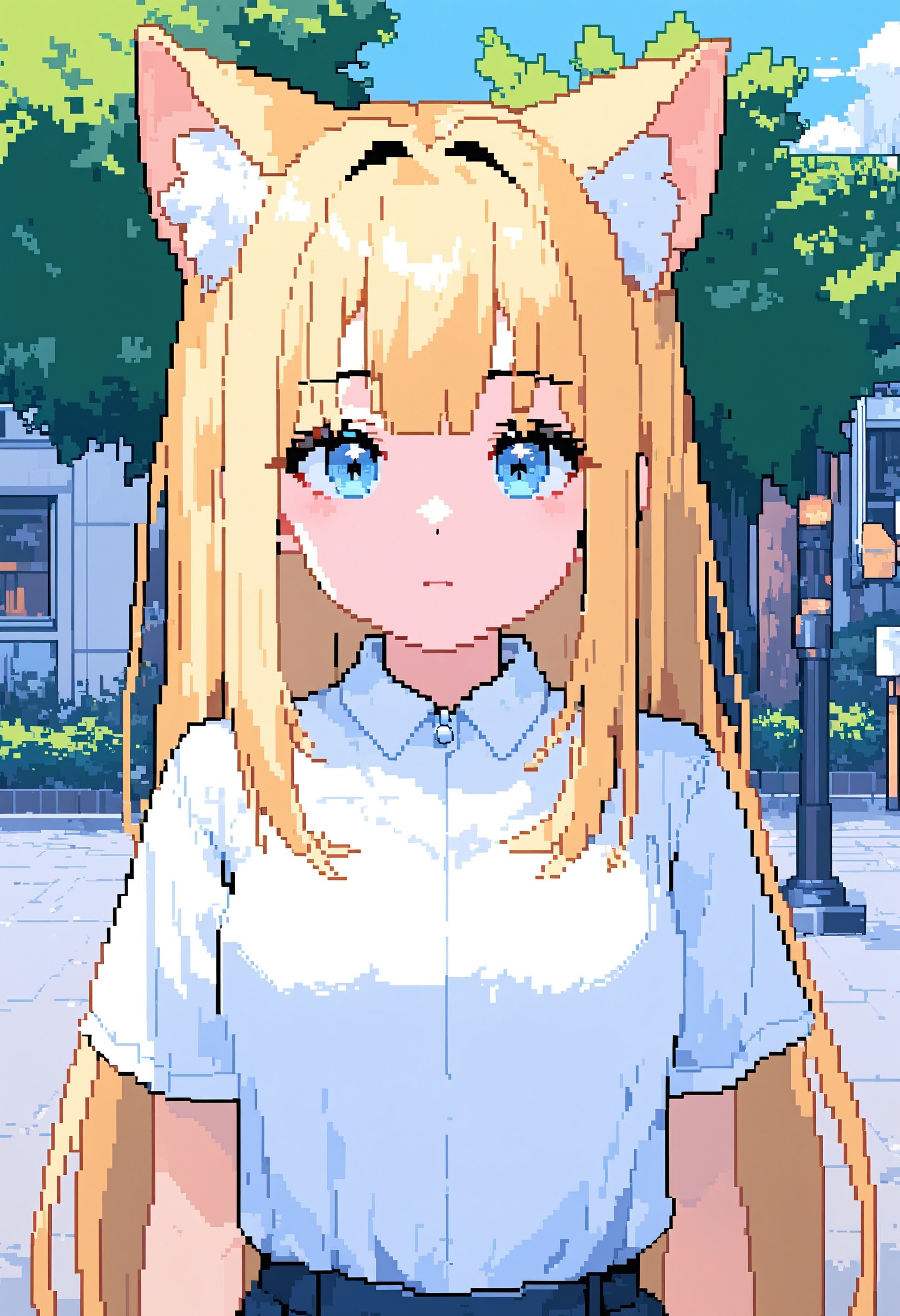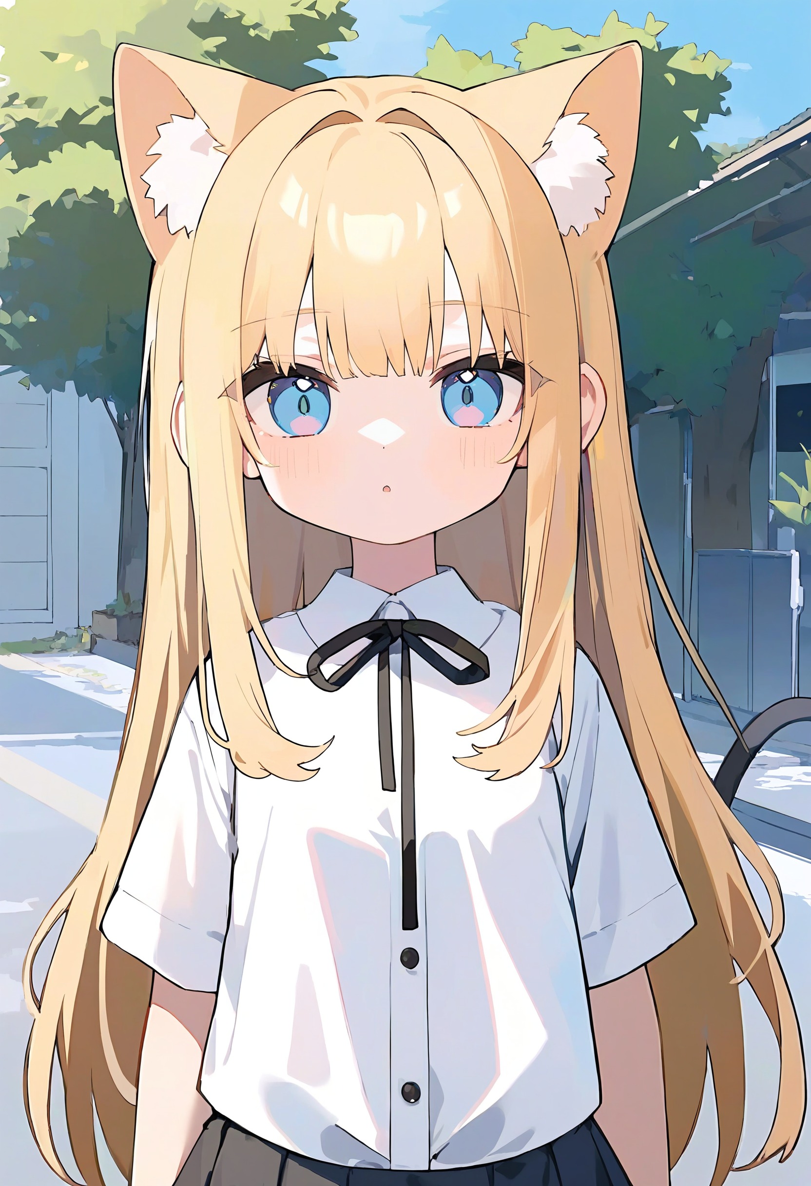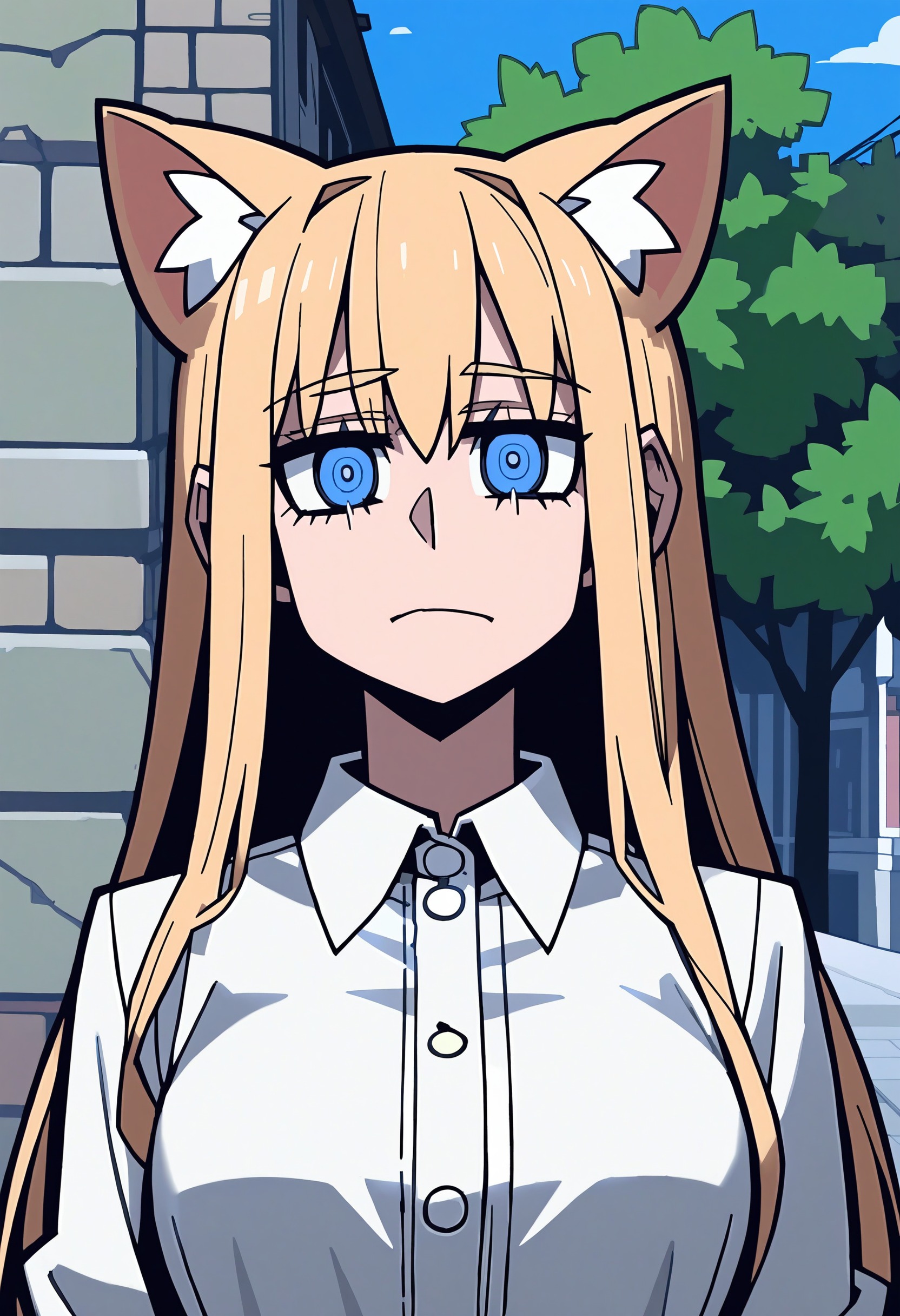 🎨 *, 1girl, cat ears, blue eyes, blonde hair, solo, white shirt, skirt, upper body, straight on, beautiful eyes, outdoors