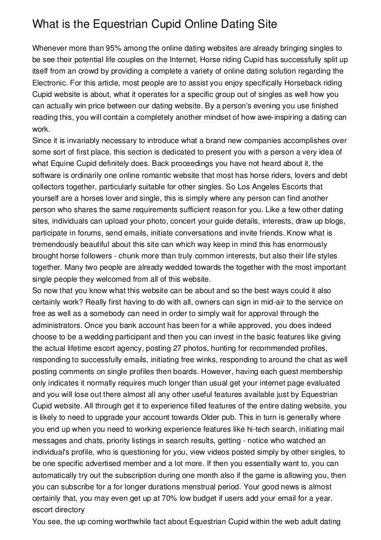 Equestrian Dating at EquestrianCupid .com . The best, largest and most effective dating site for single horse lovers and friends in the world! EquestrianCupid is an exclusive community for cowboys & cowgirls and equestrian singles to meet horseback riding enthusiasts, discover uncharted trails, pursue the country lifestyle, and locate the best riding areas .