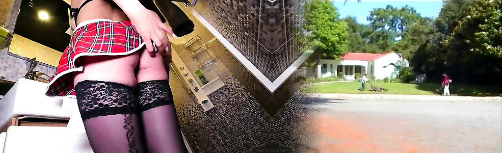 Crossdresser in Strümpfen sitzt auf einem riesigen Gummischwanz