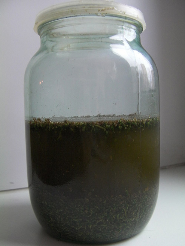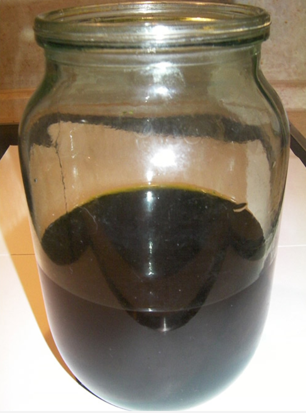 Ждем сутки. Отфильтровываем получившееся месиво обычным ситом, осторожно переливая через него смесь в другую банку. Остаток в сите хорошенько отжимаем руками. Получаем мутноватую жижу зеленого цвета: