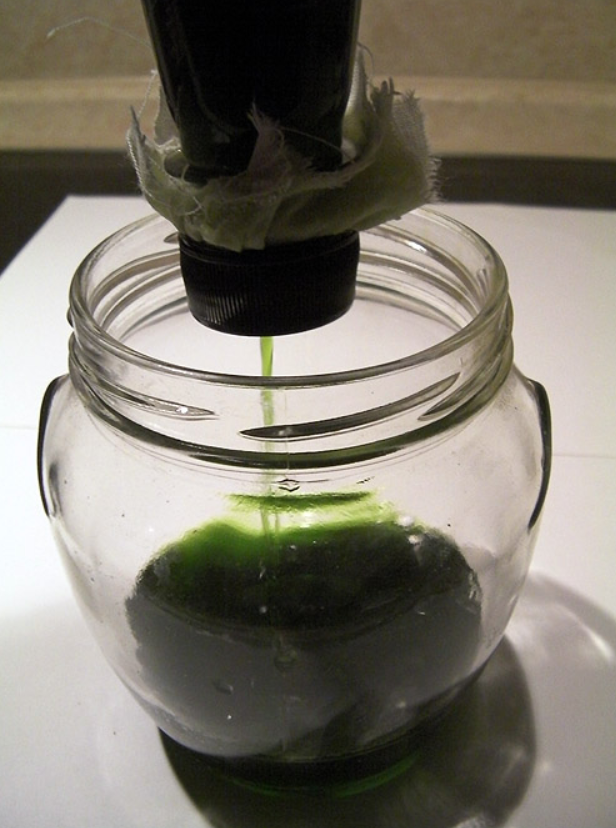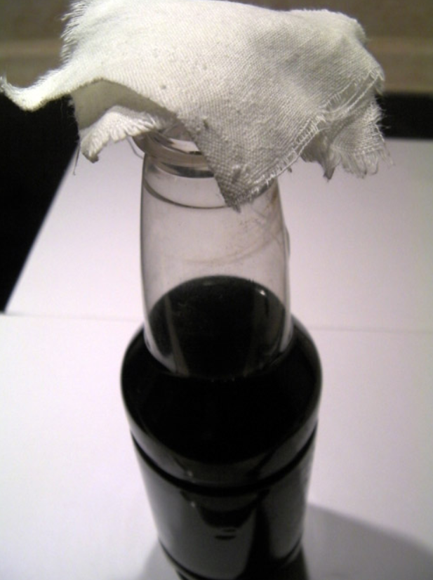 Теперь из пластиковой бутылки, двух кусочков хлопковой ткани, сложенной волокнами под 45 градусов, и пробки (с дыркой диаметром около 10 мм) сооружаем фильтр тонкой очистки, работающий под давлением. Пробку накручиваем на пару витков прямо поверх ткани. Не накручивайте пробку до упора – это уменьшит площадь фильтрования, и фильтр слишком быстро забьется. Чем меньше ткани вы используете, тем меньше драгоценной жидкости в неё впитается: