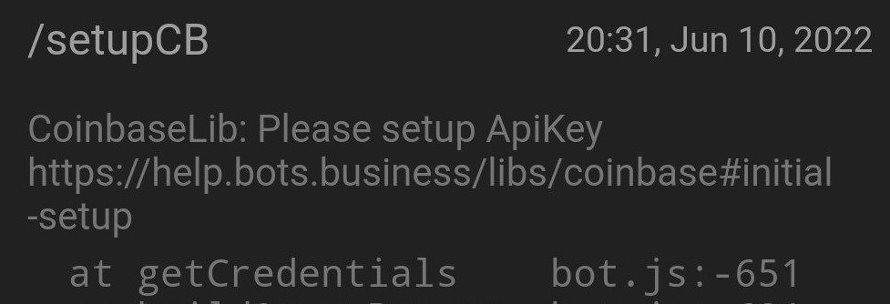 Error with CoinbaseFixingJust run BJS:Libs.Coinbase.setup();Then go to App > Bot > Admin panel and fill Api Key and Secret: