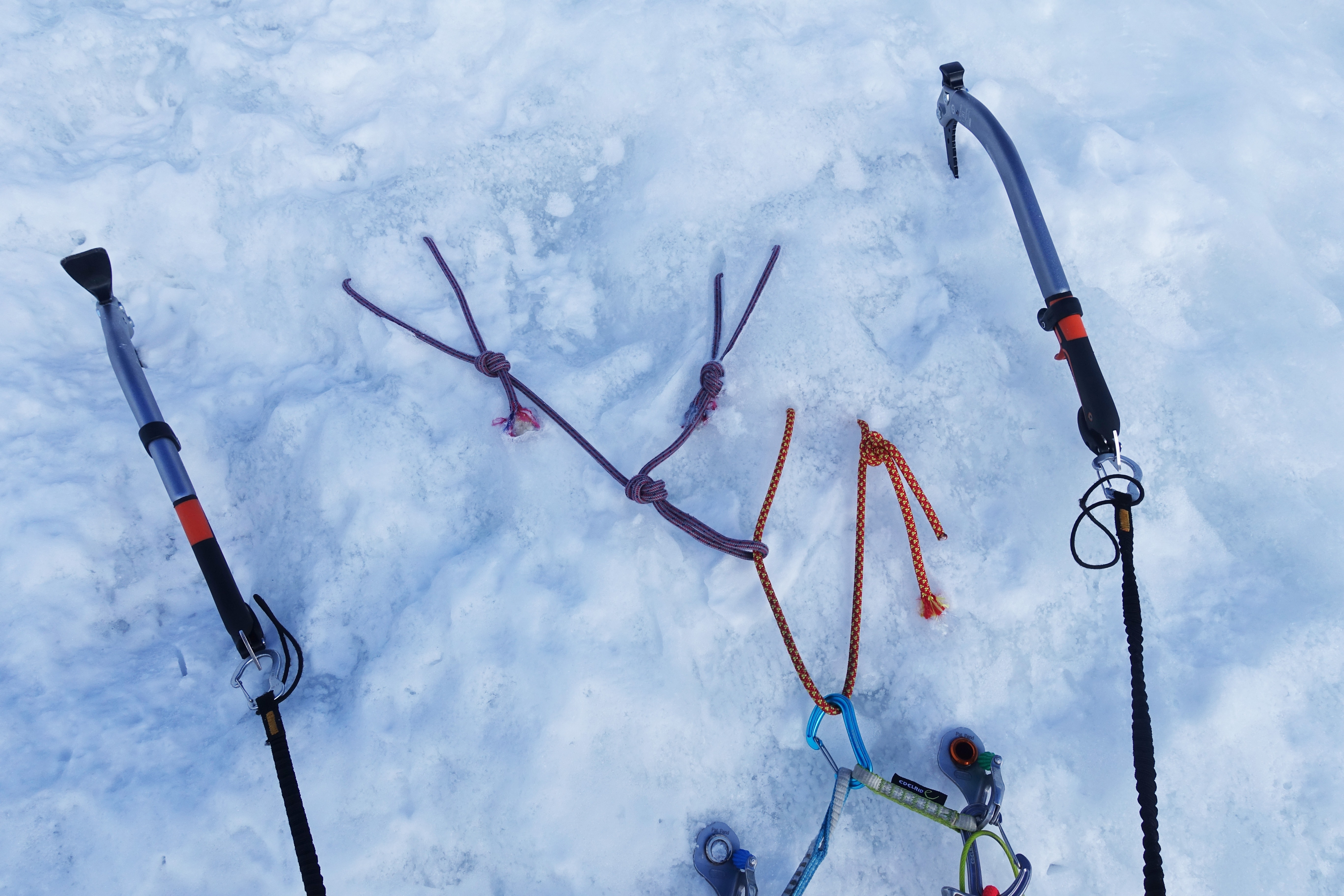 Normalmente, el aseguramiento en la ruta Nevado Alpamayo se organiza utilizando estacas para nieve; esta es una de las características específicas de la ruta. Sin embargo, en la temporada 2023 hay una cantidad inusualmente grande de hielo puro en la ruta, lo que es conveniente para asegurar los tornillos de hielo y organizar la "eslinga Abalakov".