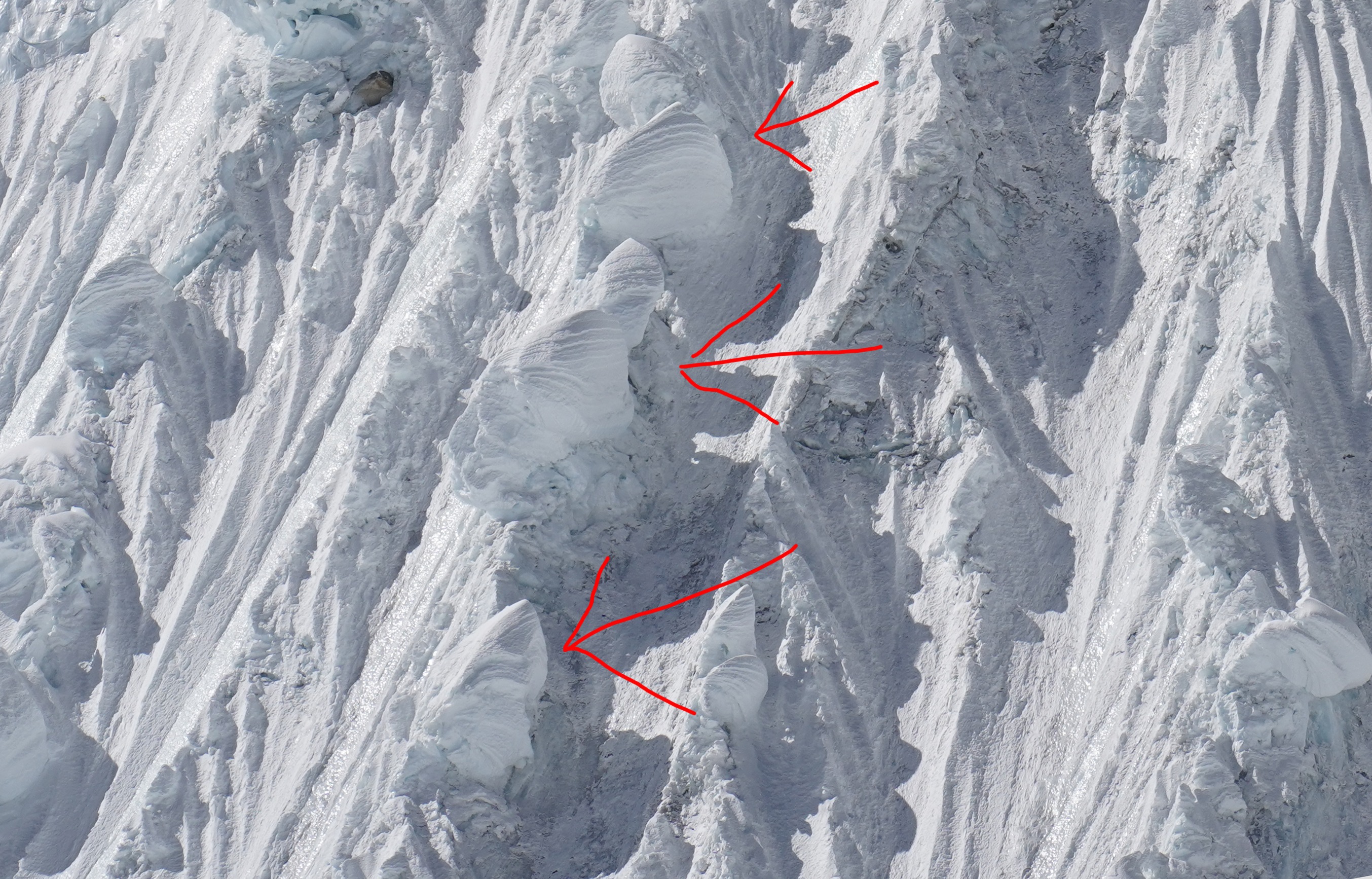 Definitivamente, hay algunos fallos en todo este esplendor. Tres grandes “hongos” de nieve cuelgan sobre la línea de ruta, que en condiciones normales parecen estables....