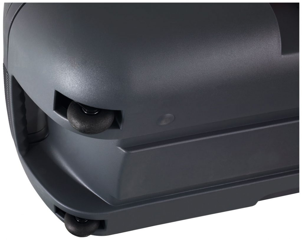 Конструкция позволяет сложить систему в компактный кейс с колёсиками и ручкой для удобной, комфортной перевозки. Внутри предусмотрено место как для своих складных стоек, так и для дополнительных аксессуаров (например, микрофонов и кабелей).