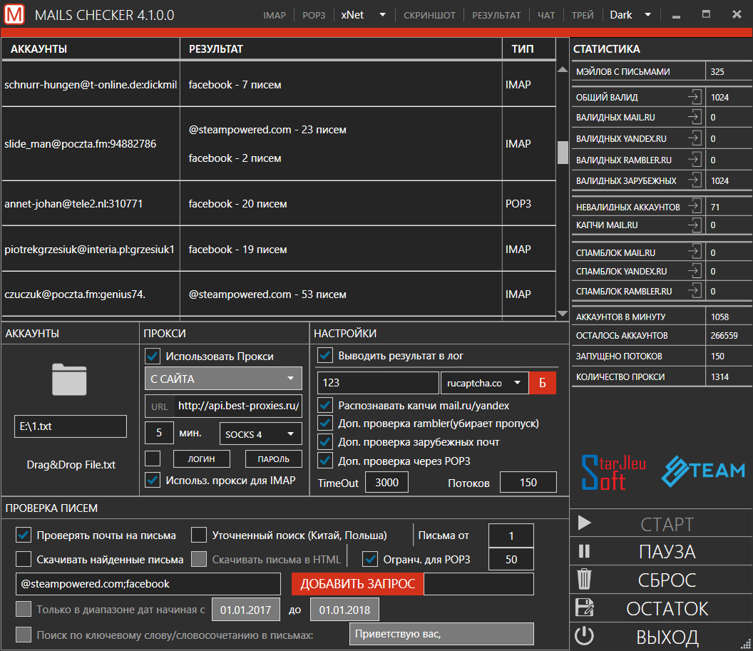 Чекер Писем Почтовых Сервисов by StarJIeu Soft - программа, которая позволит вам в многопоточном режиме проверять на нужные запросы мэйлы 2 самых популярных почтовых сервисов ру сегмента - yandex.ru, mail.ru + все их поддомены и так же зарубежные сервисы поддерживающие imap и pop3.