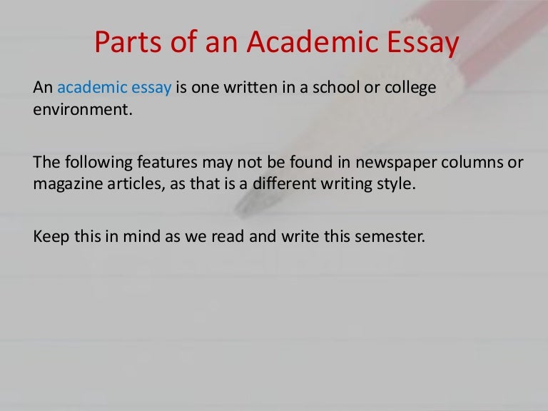 An essay is, generally, a piece of writing that gives the author's own argument, but the definition is vague, overlapping with those of a letter, a paper, an article, a pamphlet, and a short story . Essays have traditionally been sub-classified as formal and informal . Formal essays are characterized by "serious purpose, dignity, logical organization, length," whereas the informal essay is . . .