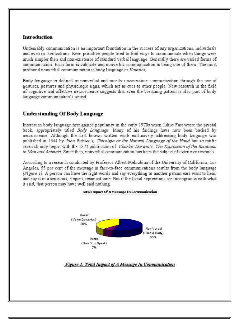 Body Language And Its Effect On Communication English Language Essay . Introduction: Language consists of verbal- language and nonverbal- language . Nonverbal- language , which is called body-language , plays an important role in delivering message when people communicate with other . A research show than in total impact of a message, 7 per cent comes . . .