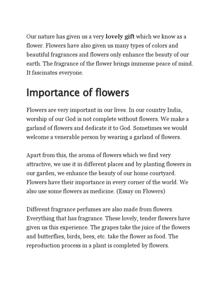 FAQ of Flowers Essay . Question 1: Why flowers are important in our life? Answer 1: The importance of flowers is everywhere . From nature to human use, they are important . They can feed insects, birds, animals and humans . Further, they provide natural medicines for humans and some animals . Most importantly, without flowers , plants would simply be . . .
