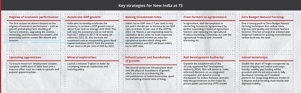 Theme :-Modi government promised ' New India ' by 2022 , when India will complete 75 years of independence . By 2022 , it is promised that India will be free of corruption, black money, nepotism, casteism and dirt . By then, youth and women will get ample opportunities, farmers will be able to double their income & poor will have concrete houses, according to Modi government .