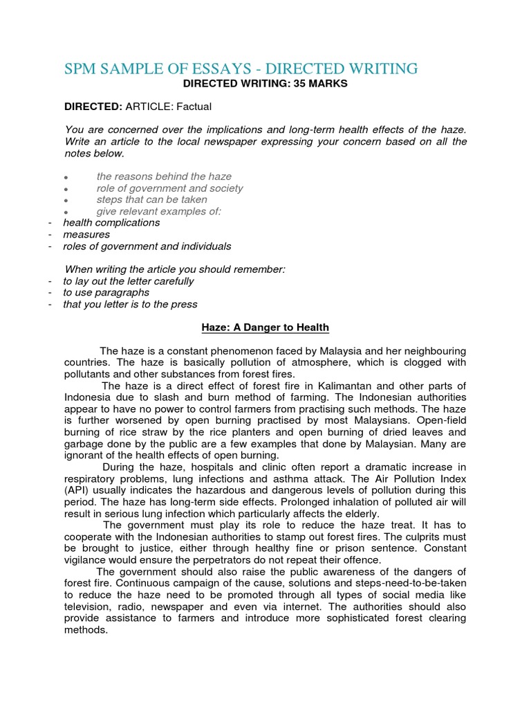 SPM SAMPLE OF ESSAYS - DIRECTED WRITING; SPM SAMPLE OF ESSAYS - DIRECTED WRITING DIRECTED WRITING: 35 MARKS . . . . During the haze, hospitals and clinic often report a dramatic increase in respiratory problems, lung infections and asthma attack . The Air Pollution Index (API) usually indicates the hazardous and dangerous levels of pollution during . . .