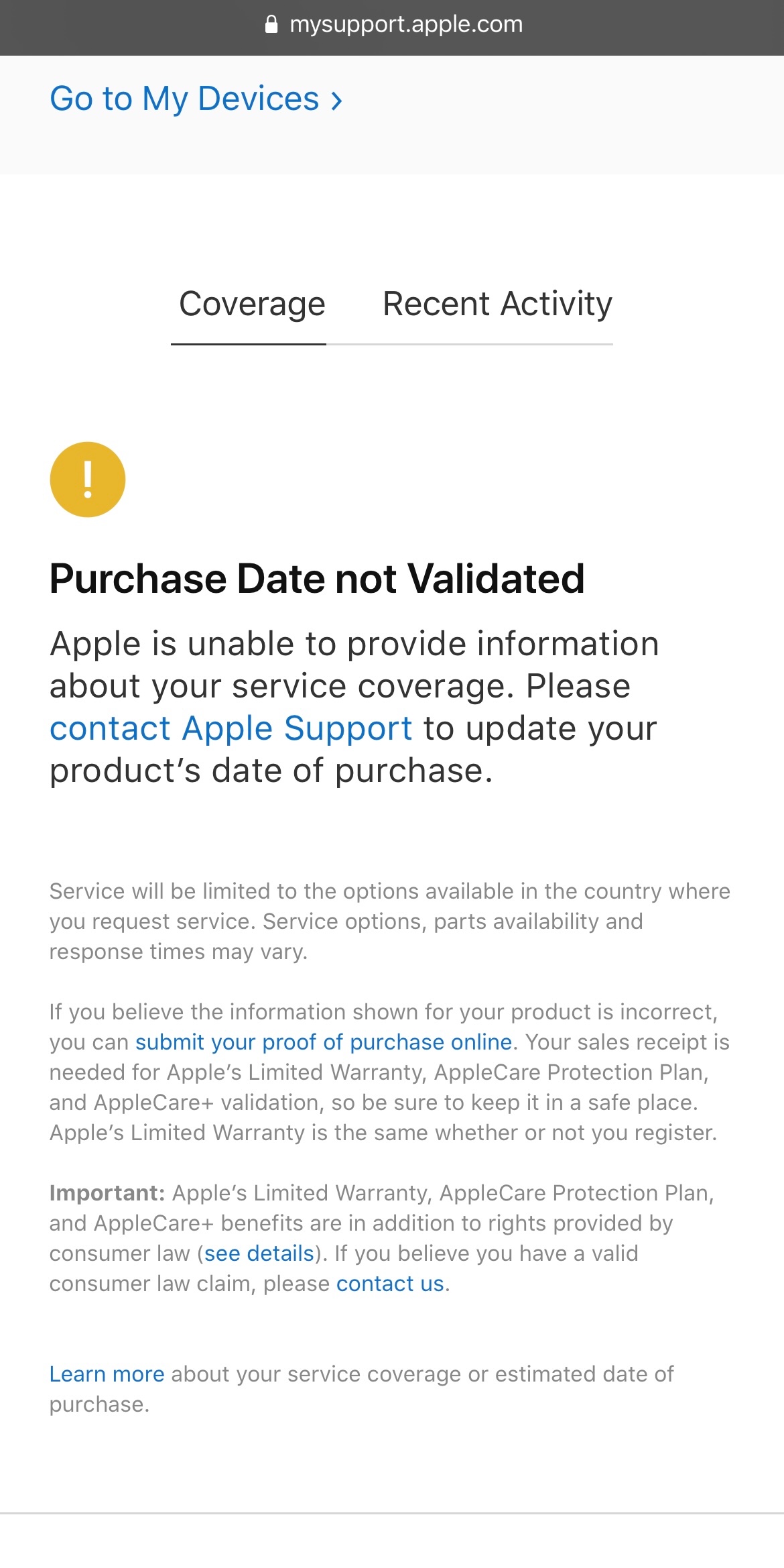 Depending on when or whether you registered your product, if you purchased it from an Apple authorized reseller or Apple Store, the estimated purchase date may be incorrect . If you believe that the information is inaccurate, please update the information by contacting Apple using the appropriate link on this page .