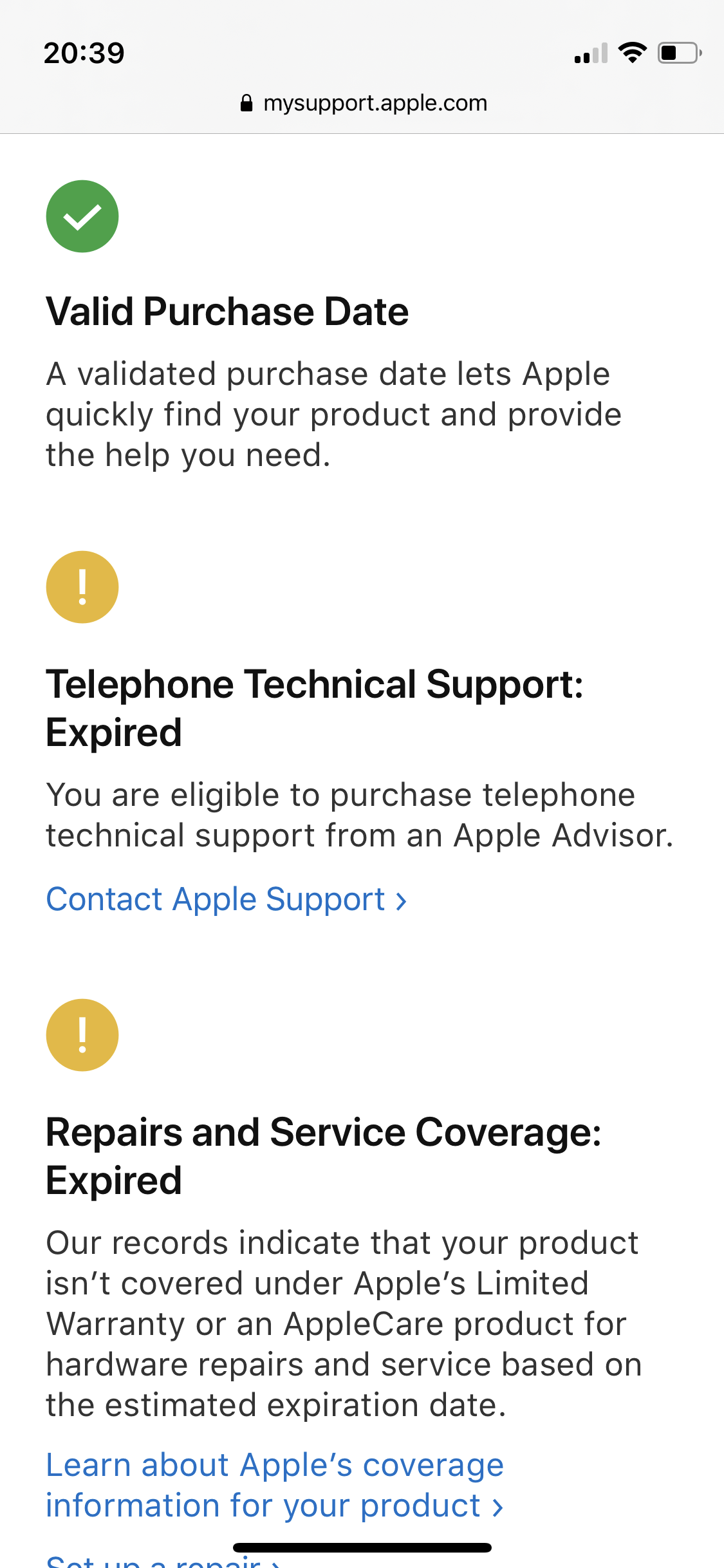 To get the estimated date of purchase , subtract 1 year from the Coverage Expiry date . Check activation date (original purchase date ) of your iPhone, iPad, or Mac anytime If your iPhone, iPad, Mac, or any other Apple device is activated with your Apple ID, you can find its purchase date or activation date anytime by following the steps below: