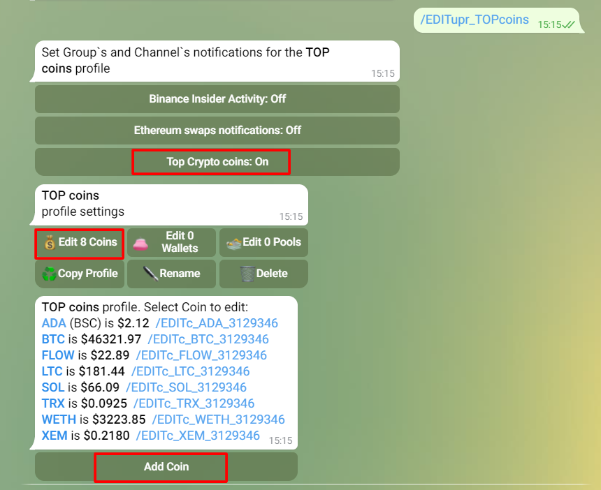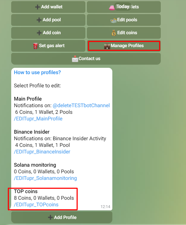 Например, мы хотим добавить мониторинг монеты в одну из наших групп. Мы создали группу "Top crypto coins". В ней мы ослеживанием движения цен некоторых топ монет. EtherDrops бот уже был добавлен в группу и мы так же создали Profile специально для этой группы. Данный Profile мы назвали "Top Coins". Открываем "Главное Меню", выбираем "Manage Profiles", открываем Profile "TOP Coins".