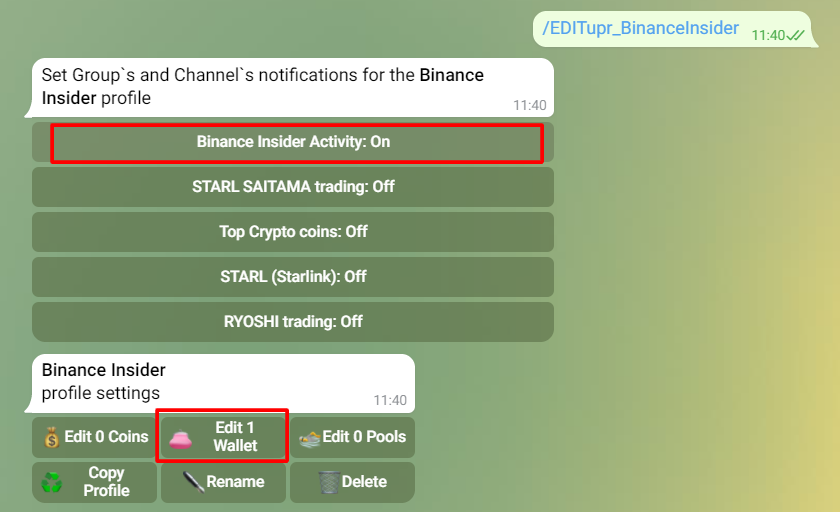 Далее создаём Profile и добавляем в него кошелёк этого инсайдера. Ставим отметку "ON" рядом с каналом "Binance insider activity”.