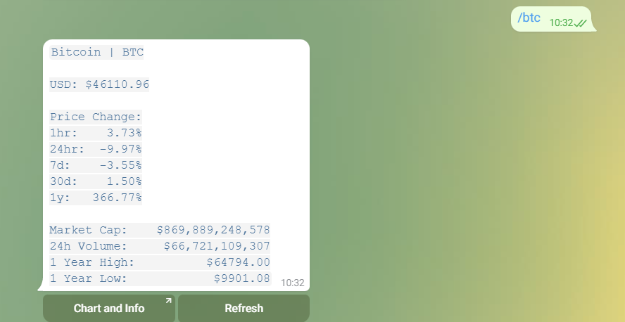 /btc или /bitcoin (или любая другая криптовалюта по тикеру или полному названию)