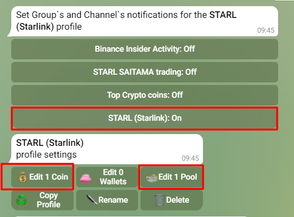 Добавьте бота в группу. Далее создайте Profile для STARL. Добавьте монету STARL (по названию или адресу) и пул STARL-WETH. По желанию, добавьте круных держаталей монет в мониторинг. Убедитесь что переключатель "ON" напротив вашей группы.