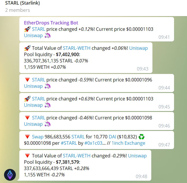 Если вы админ канала или группы то коммьюнити высоко оценит вашу вовлчённость в проект если присылать уведомления по крупным транзакциям, движением средств крупных холдеров или другим важным событиям по конкретной монете. Например, вы являетесь админом группы посвящённой STARL (Starlink).