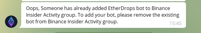 ⦿ Возможно добавить лишь одного бота в одну группу/канал. В случае если бот уже добавлен, вам придёт следующее уведомление: