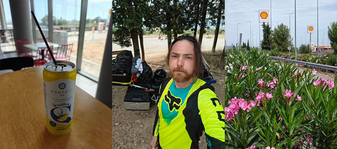 На 300-километровом маршруте я останавливался три раза, просто для того, чтобы зайти в помещение с кондиционером и выпить чего-нибудь холодного, так как реально опасался схватить тепловой удар. Езда в джерси, как на фото выше, не спасла. Ощущение такое же как открыл духовку проверить готовность мяса - обдувает горячим ветром. В итоге пришел к оптимальному решению - расстегнуть рукава и приокрыть молнию куртки сверху, чтобы воздух задувал в рукава и выходил у шеи, охлаждая тело засчет своего движения. Зато как пахнут цветы, которыми усажены абсолютно все обочины трасс в Греции - это непередаваемое удовольствие.