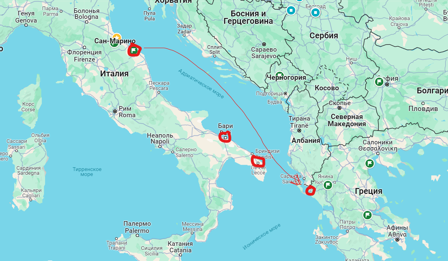 Следующим пунктом был город Римини. К этому моменту я уже понял, что хочу заехать в Грецию, но по суше это было не интересно, и выбор пал на паром с восточного побережья Италии до города Игуменица в Греции. На восточном побережье Италии есть три крупных порта, из которых отправляются паромы в Грецию: Бриндизи, Анкона, Бари. До Бриндизи и Бари было далековато по суше, поэтому выбор пал на Анкону. В самом портовом городе ночевать и тусить грустно, поэтому решил переждать на классическом "курорте", заодно устроив себе пару дней без поездок. Таким образом дальнейший маршрут оформился следующим образом: