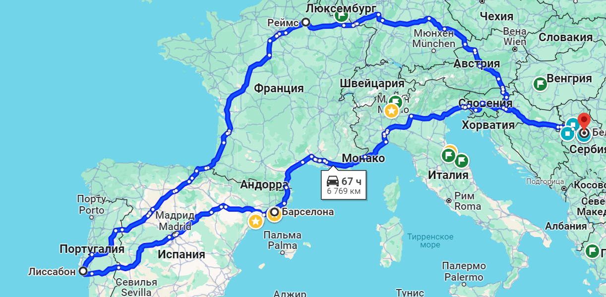 Маршрут я планировал следующим образом: сперва вбил в гугл карты Белград, Реймс, Лисаббон, Барселону, и снова Белград. Широкими мазками посмотрел что мне предложит навигатор. Протяженность маршрута оказалась около 7000км. Один из принципов, которым я руководствовался - дневной пробег не более 500 км. Я хотел, чтобы это было комфортное путешествие и не претендовал на выполнение норматива "железная жопа".