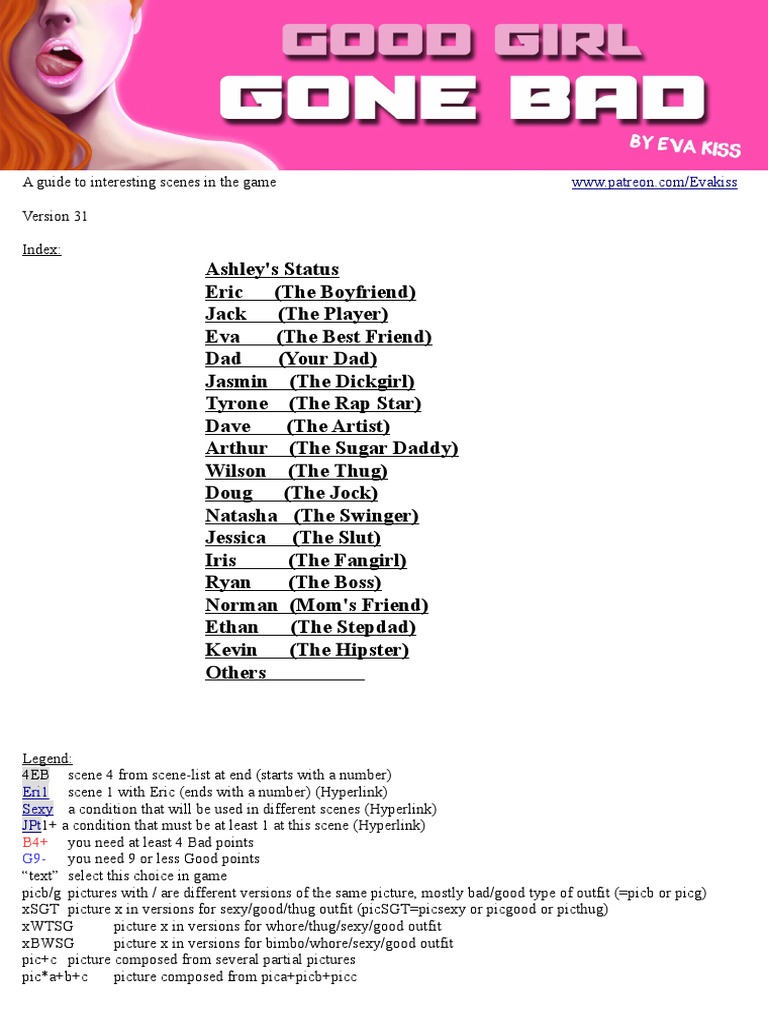 Title: Good Girl Gone Bad: Aliases: GGGB: Length: Very long (> 50 hours) Developer: Eva Kiss: Publishers: Eva Kiss & JohnDupont: Links: Wikidata, IGDB, VNStat: Description . You play as Ashley and make choices that will affect her story in a meaningful way .