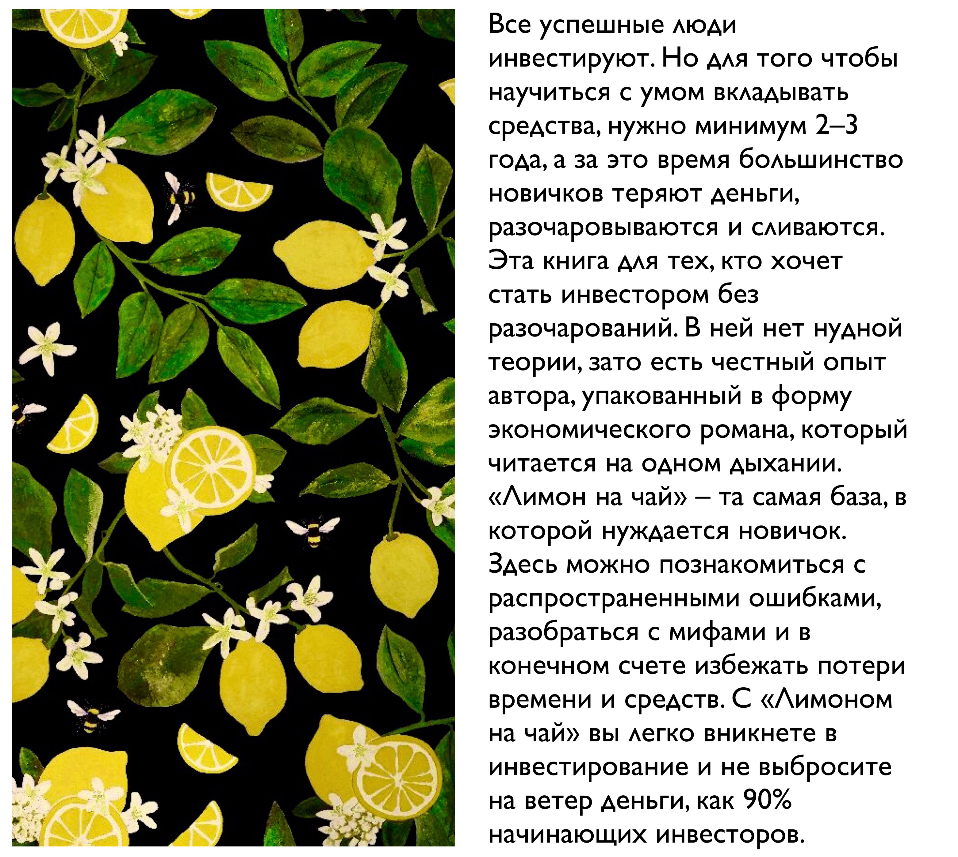 Я так вдохновился, что взял и написал книгу «Лимон на чай» в форме романа. Она основана на реальной истории из моей жизни, хотя некоторые моменты пришлось доработать. Причина простая: я не хочу просто пересказывать произошедшее – мне важно, чтобы этот материал вас вдохновил, помог избежать распространенных ошибок и дал правильное понимание темы инвестирования.
