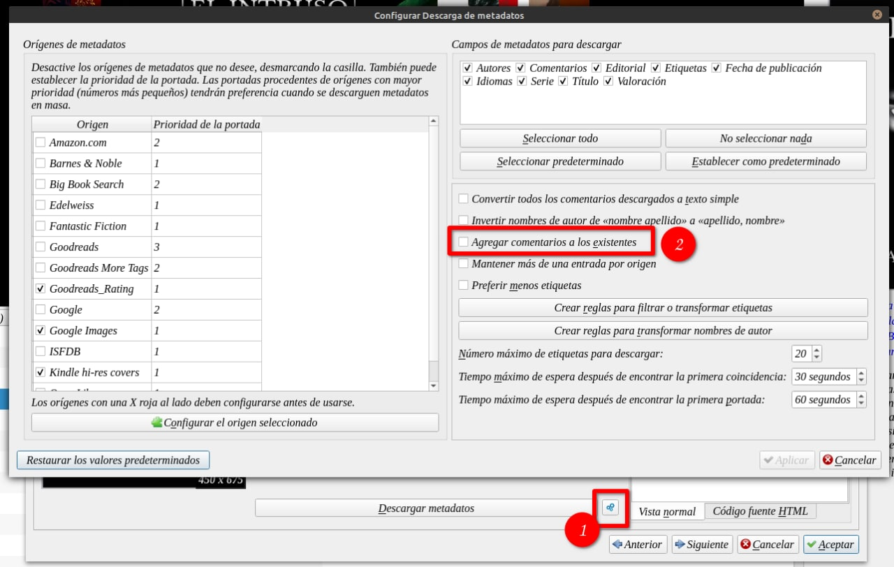En la pantalla de metadatos, tocamos las rueditas dentadas (1) y desmarcamos, en el caso de tener marcada la casilla "Agregar comentarios a los existentes". Esta opción sirve se queremos tener la sinopsis de los lugares diferentes.